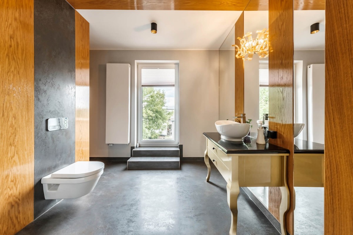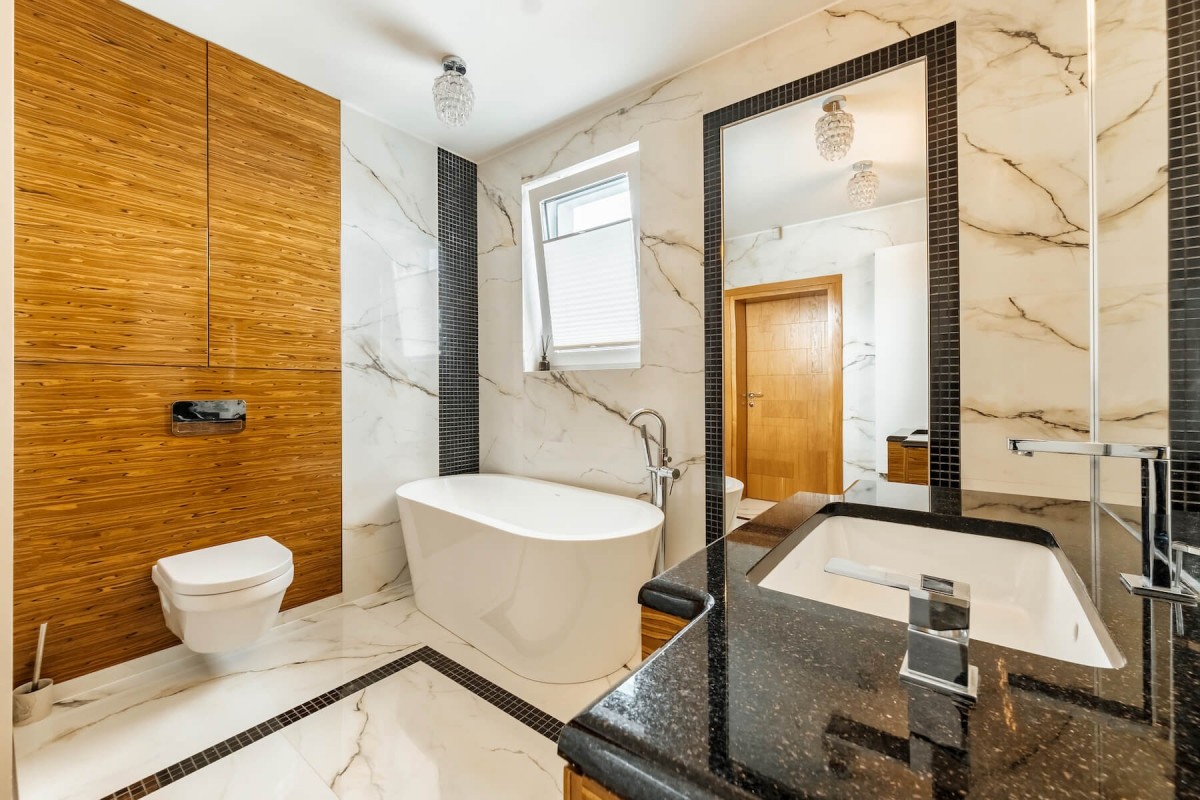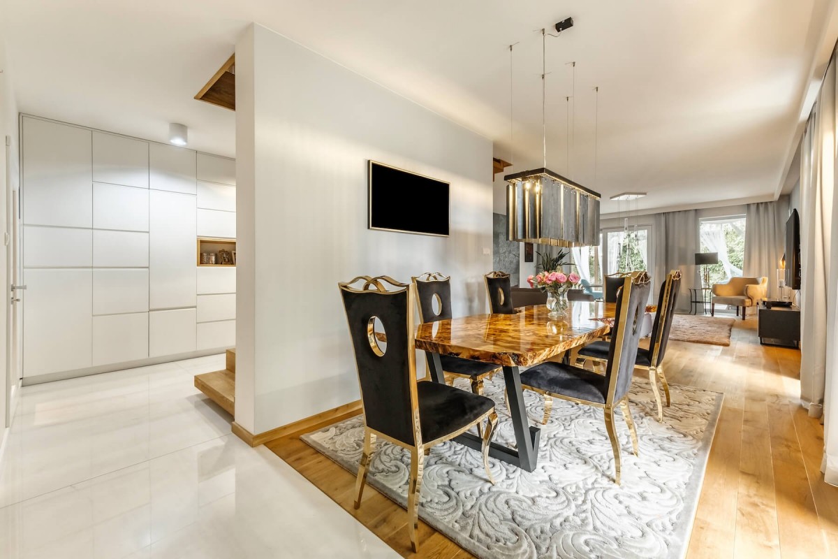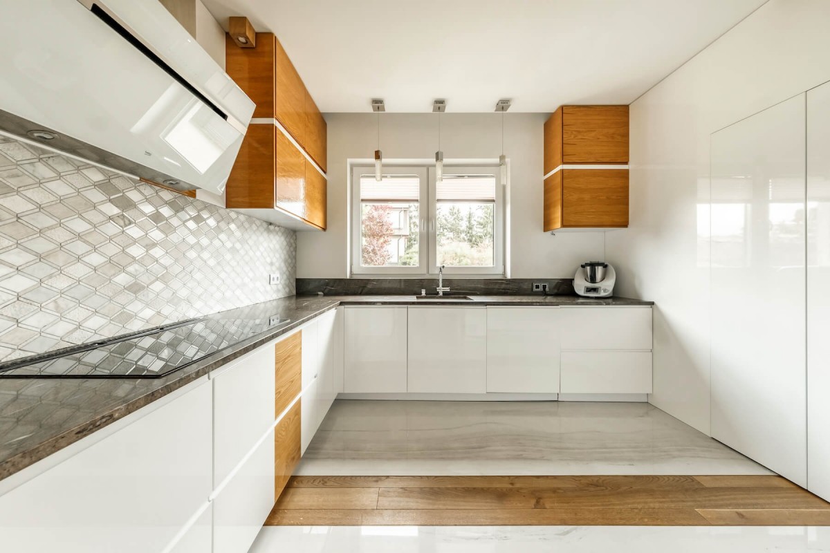 Dom wykończony w wysokim standardzie: blaty kamienne, podłoga spiek wielkoformatowy, podłogi deska dębowa, schody dębowe, armatura Villeroy Boch, biokominek Inside, stacja uzdatniania wody itd