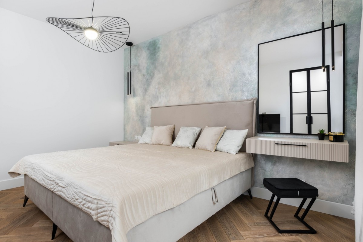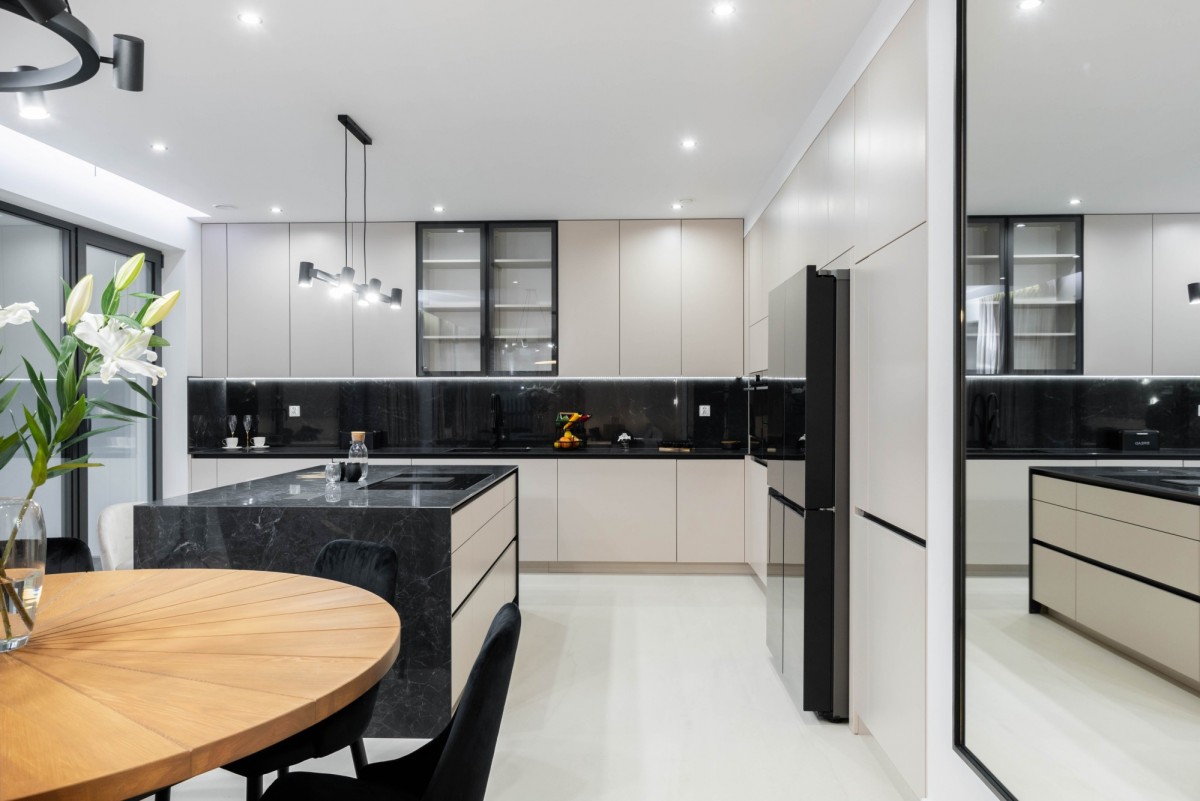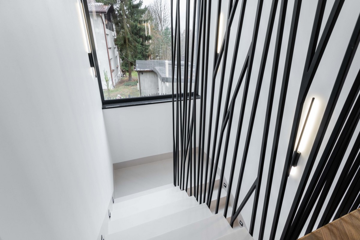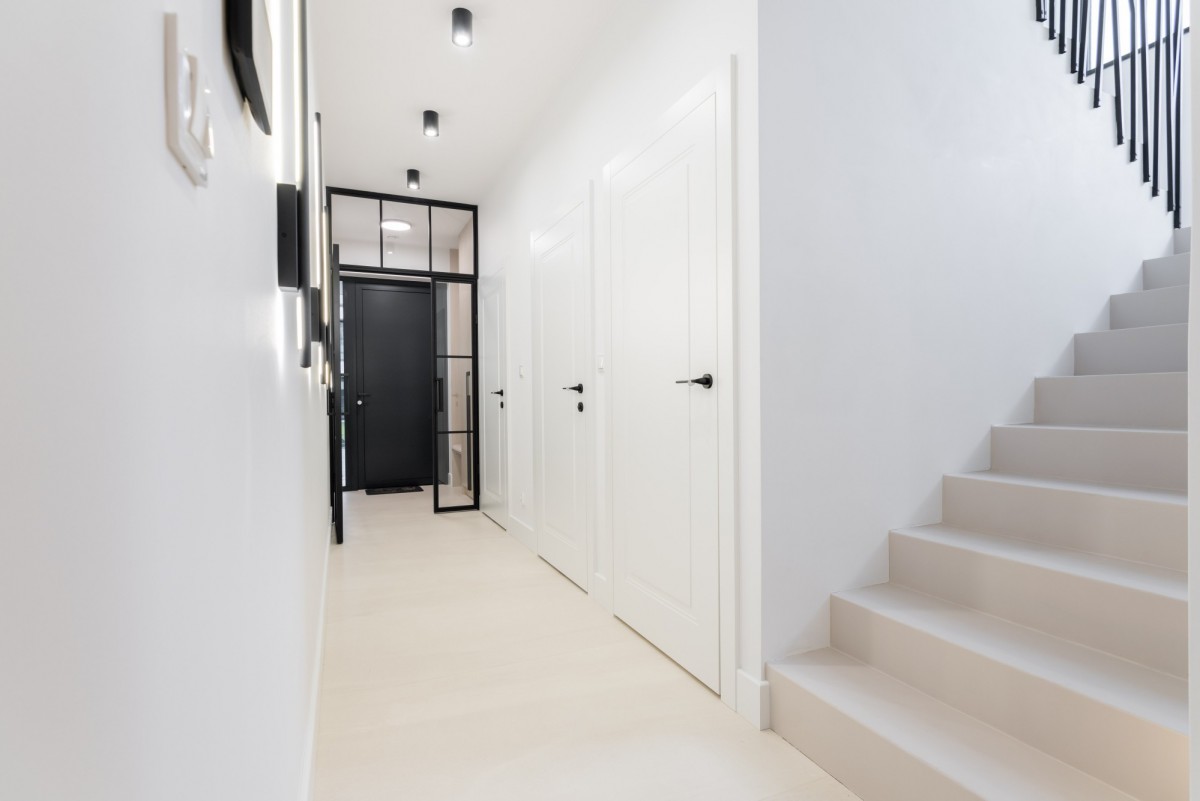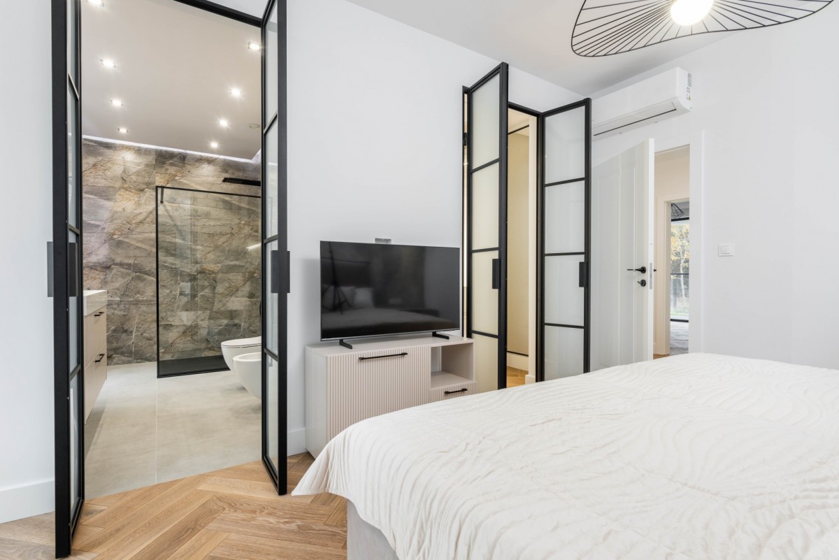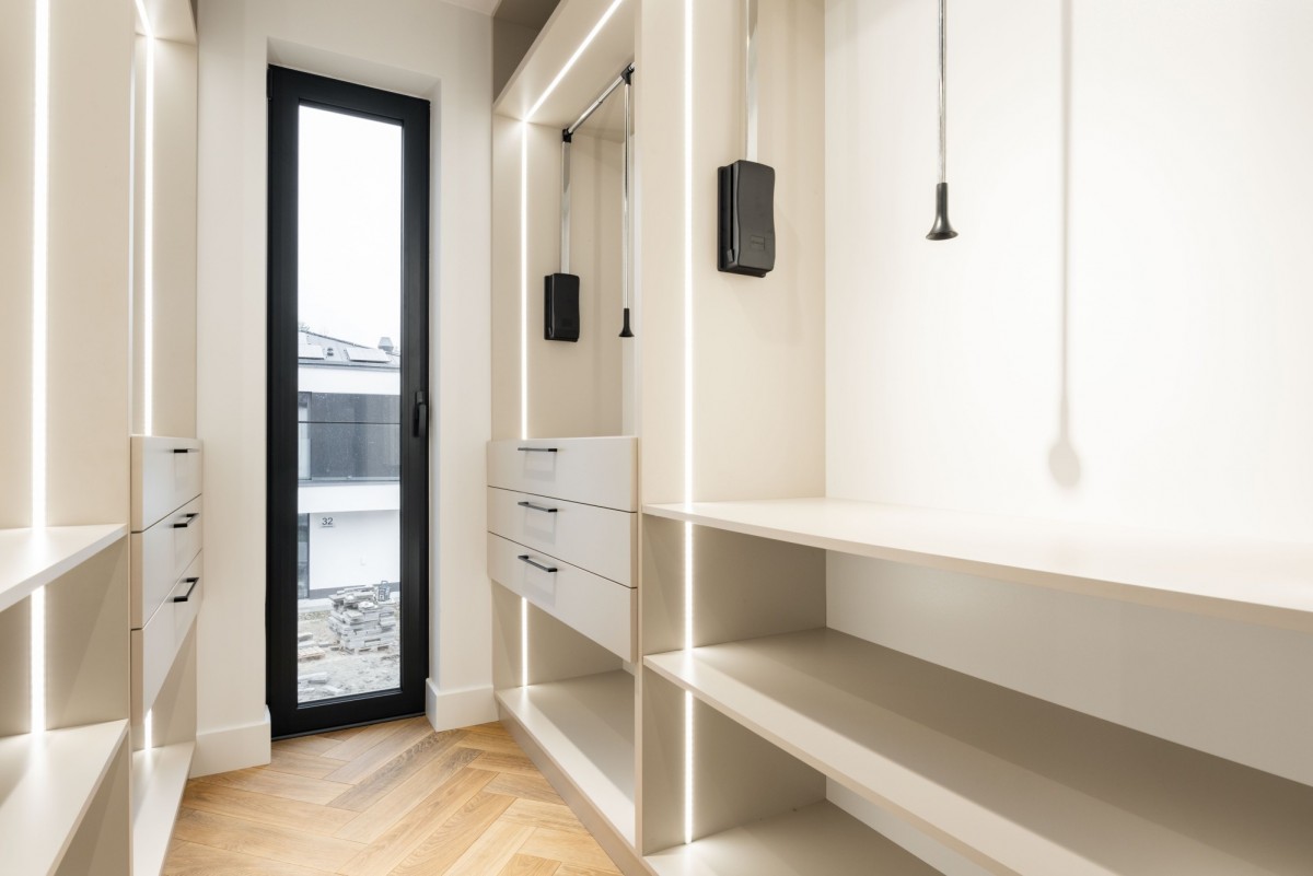Dom wykończony jest w standardzie premium: dębowe podłogi w jodełkę, aluminiowa stolarka okienna, przesuwne okna typu HS, kuchnia i zabudowy na wymiar, najwyższej klasy AGD, wielkoformatowe gresy, granity, beton strukturalny. W salonie i sypialni master – klimatyzacja, w obu pomieszczeniach telewizory.