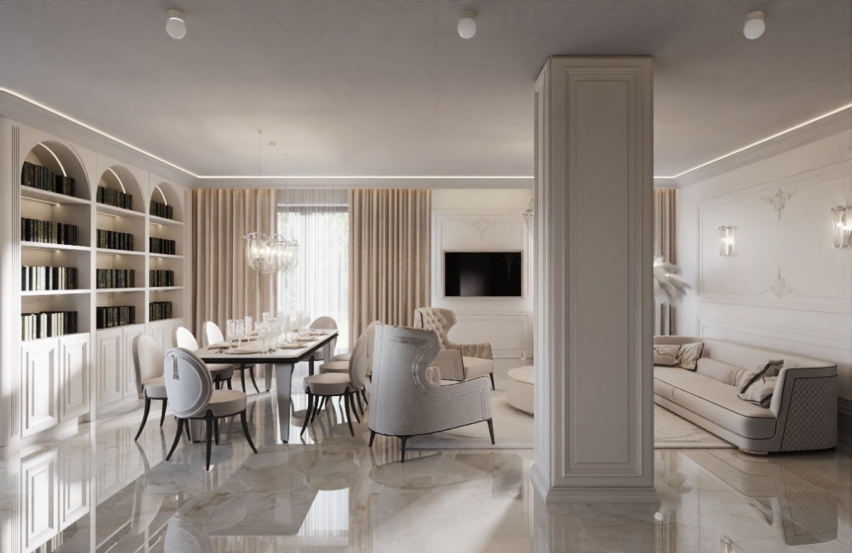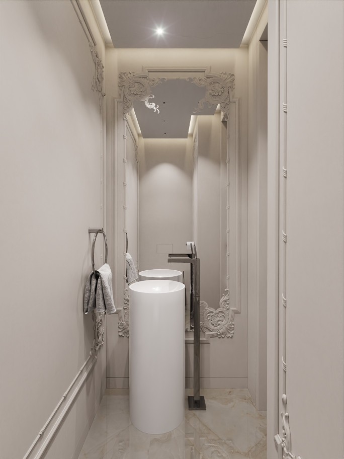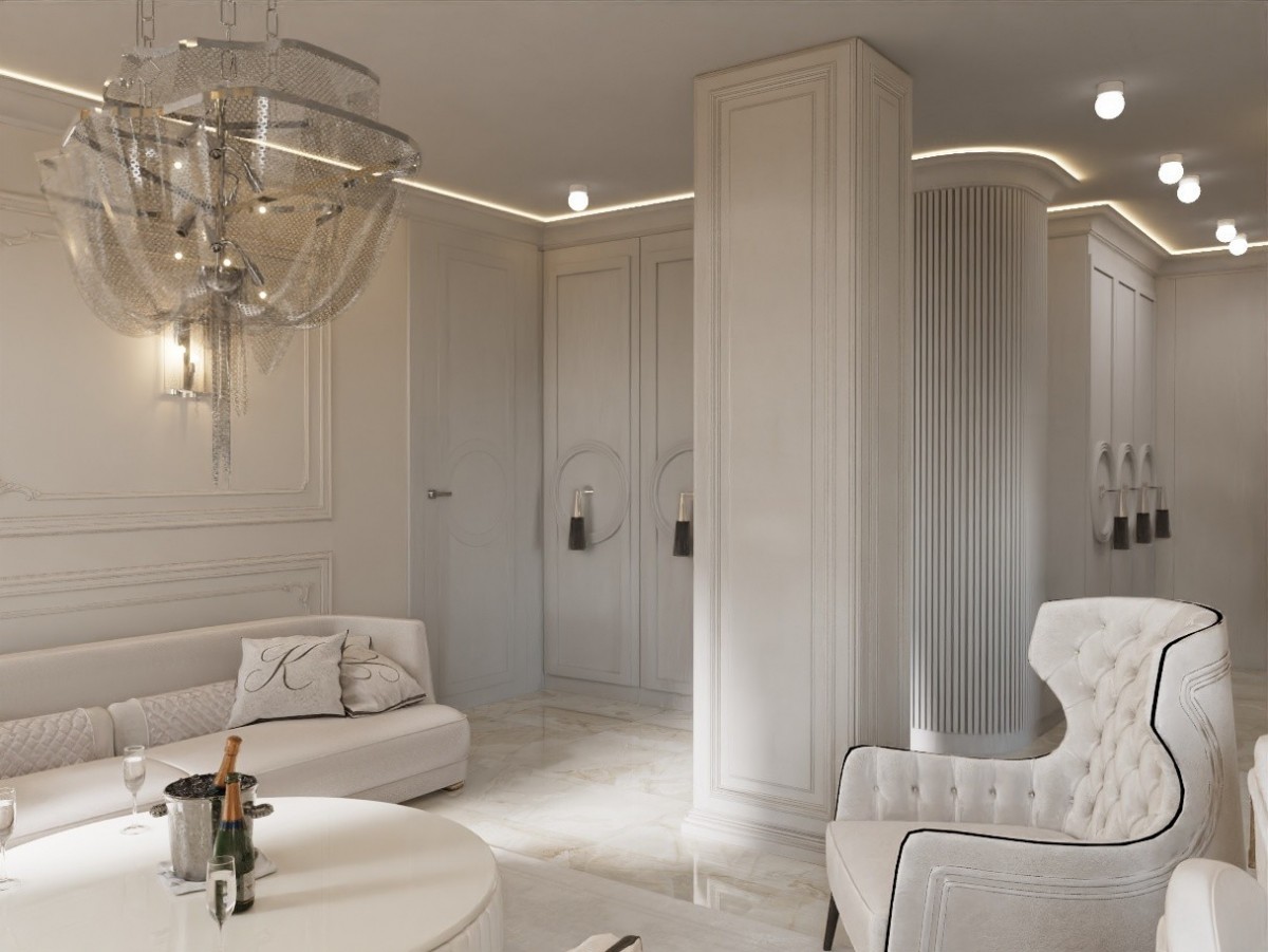 Obecnie apartament został wykończony zgodnie z projektem do stanu gotowego, przed zabudową stałą, białym montażem oraz umeblowaniem.