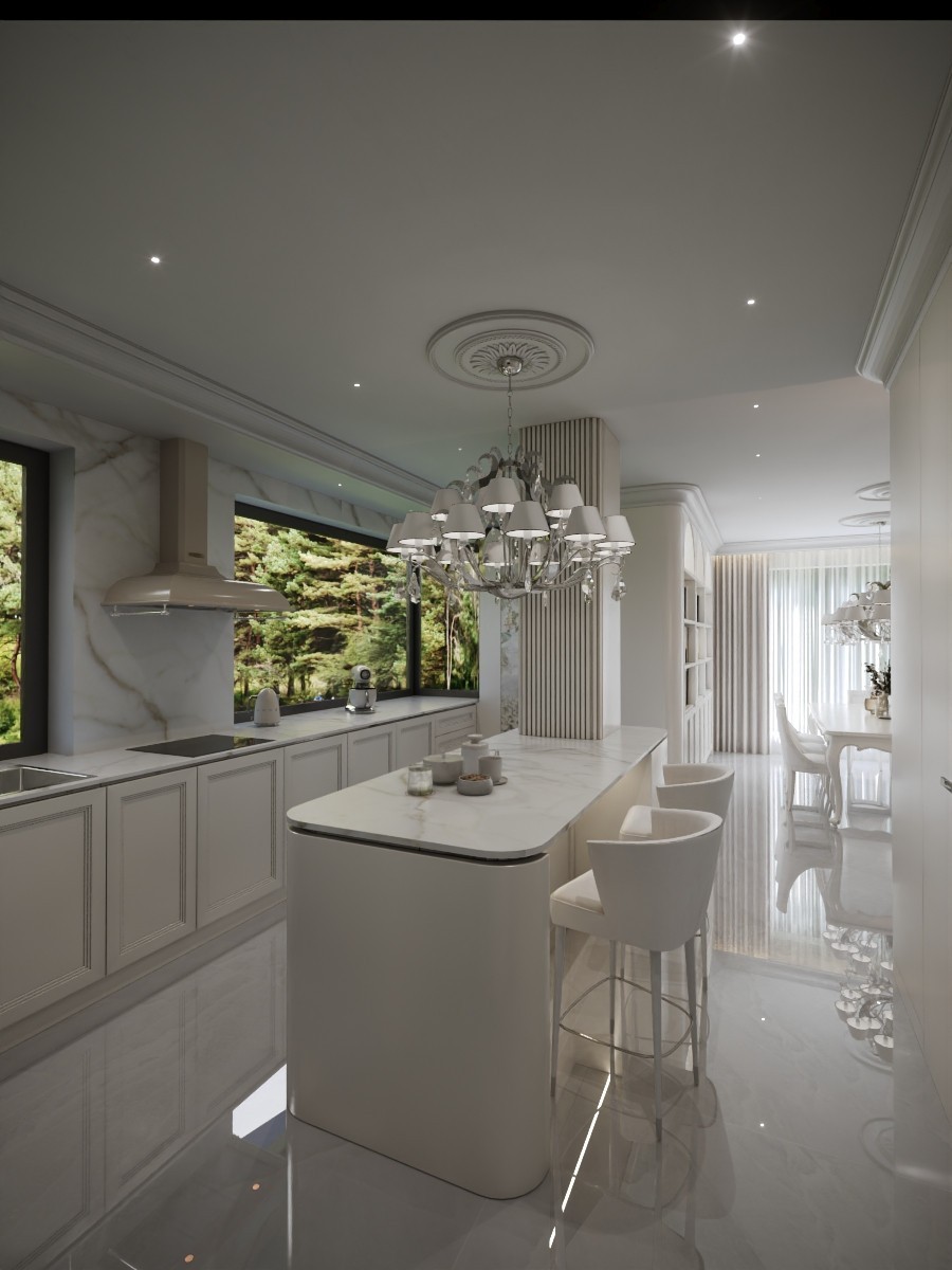– otwartej i nowoczesnej kuchni z wyspą i funkcjonalną spiżarnią