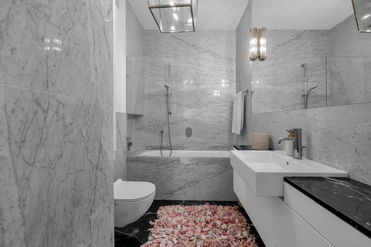 - łazienka gościnna wykończona białym marmurem