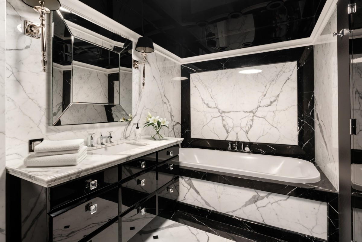 - Wysokiej klasy wykończenie – marmur na podłogach i blatach
