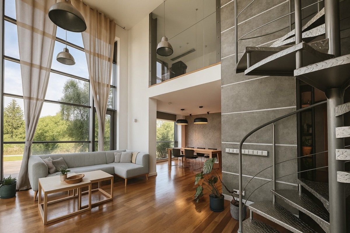 -Stylowe, kręcone schody prowadzą na antresolę, gdzie wysokie regały sięgające sufitu tworzą wyjątkową biblioteczną przestrzeń
