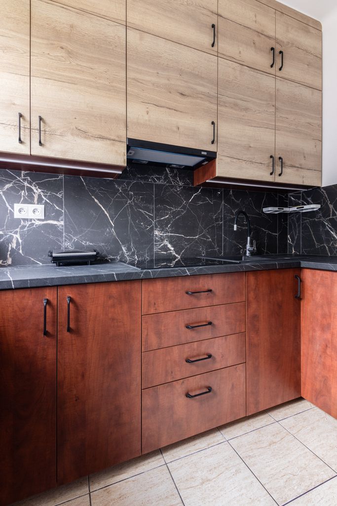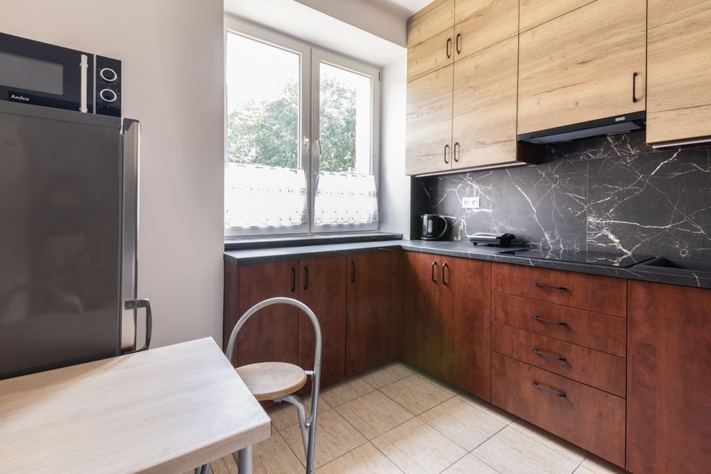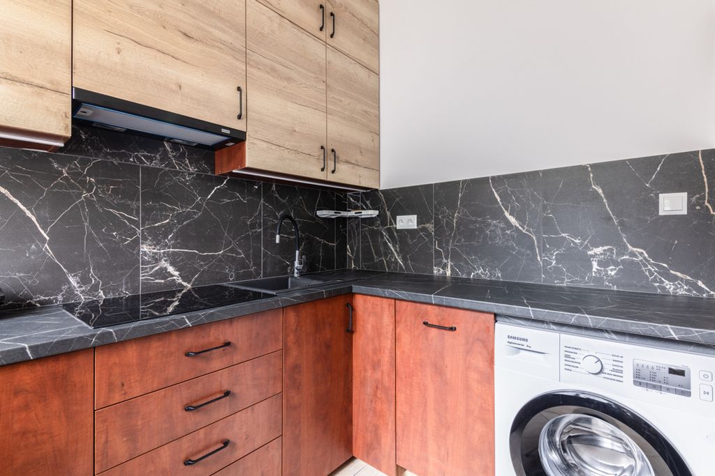 - Kuchnia: oddzielna, z nowoczesną zabudową na wymiar i wyposażeniem AGD