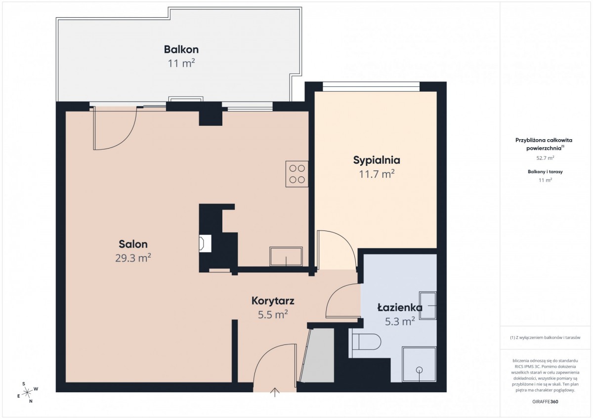 Układ: salon z aneksem kuchennym, 1 sypialnia, łazienka, przedpokój, balkon.