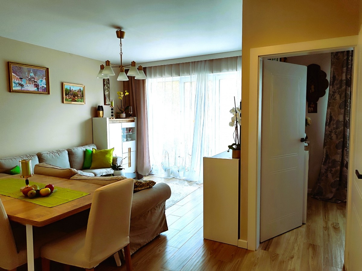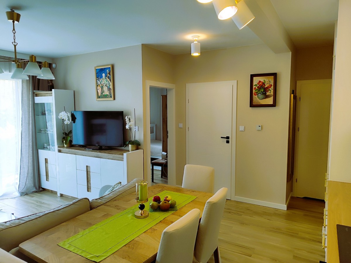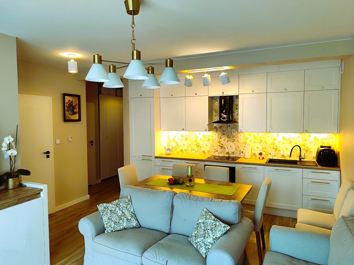 Pokój dzienny z aneksem kuchennym 25,51m, pokój 14,4m2, pokój 8,12m2, wiatrołap 1,71m2, spiżarka 1,67m2, hol 4,44m2, łazienka 4,10m2. Kuchnia została urządzone z uwzględnieniem zasad ergonomii i wyposażono ją w sprzęty znanych marek, zmywarka, pakowna lodówka, piekarnik parowy z grillem, płyta indukcyjna, wyjątkowo zgrabny okap. Zabudowa meblowa pomieści wszystkie niezbędne akcesoria a blat pozwoli wygodnie przygotowywać posiłki. W przedpokoju jasne szafy wnękowe, które pomieszczą sporo rzeczy. Łazienkę urządzono jasnymi płytkami z naturalnymi dodatkami, z kabiną prysznicową i szafką, bidettą, pralką i ładnie dopasowanym lustrem.