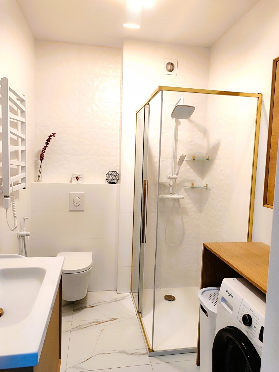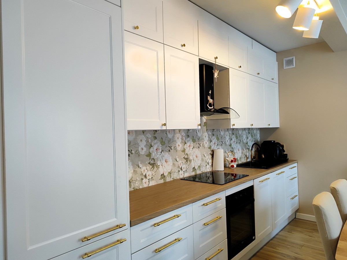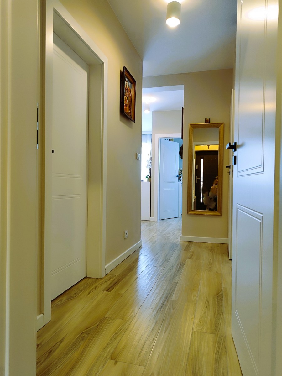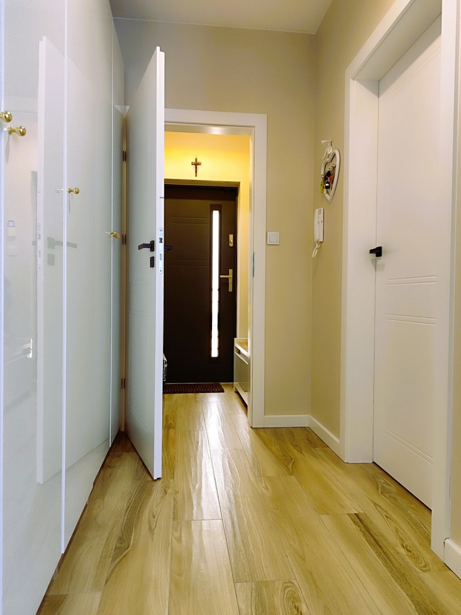 Pokój dzienny z aneksem kuchennym 25,51m, pokój 14,4m2, pokój 8,12m2, wiatrołap 1,71m2, spiżarka 1,67m2, hol 4,44m2, łazienka 4,10m2. Kuchnia została urządzone z uwzględnieniem zasad ergonomii i wyposażono ją w sprzęty znanych marek, zmywarka, pakowna lodówka, piekarnik parowy z grillem, płyta indukcyjna, wyjątkowo zgrabny okap. Zabudowa meblowa pomieści wszystkie niezbędne akcesoria a blat pozwoli wygodnie przygotowywać posiłki. W przedpokoju jasne szafy wnękowe, które pomieszczą sporo rzeczy. Łazienkę urządzono jasnymi płytkami z naturalnymi dodatkami, z kabiną prysznicową i szafką, bidettą, pralką i ładnie dopasowanym lustrem.