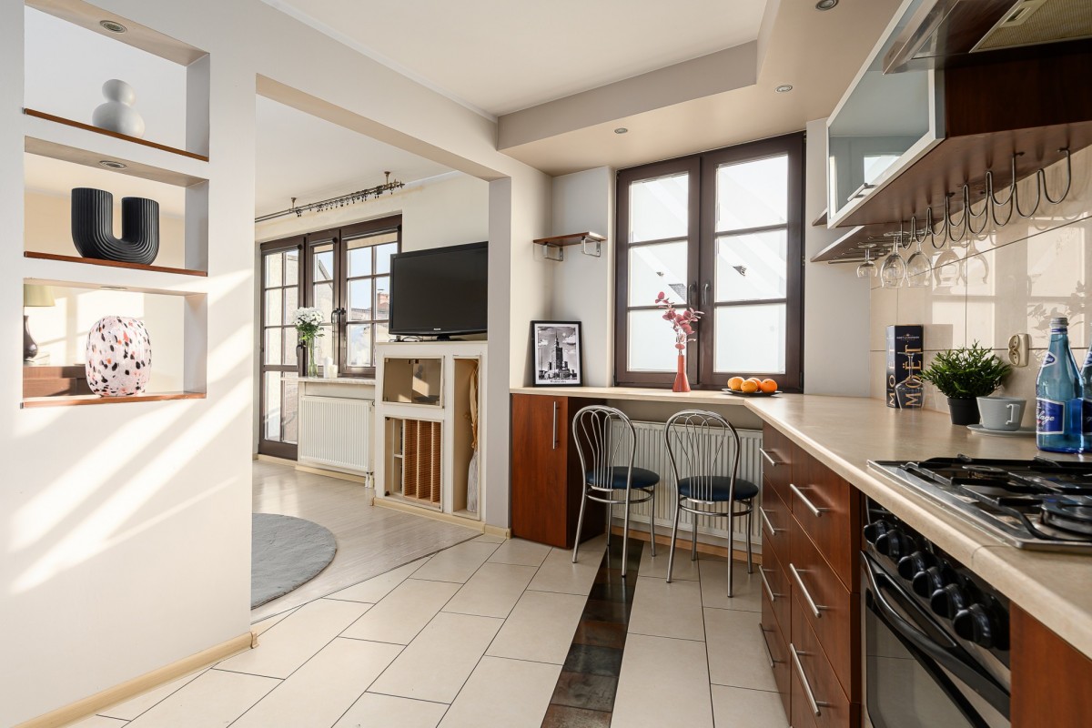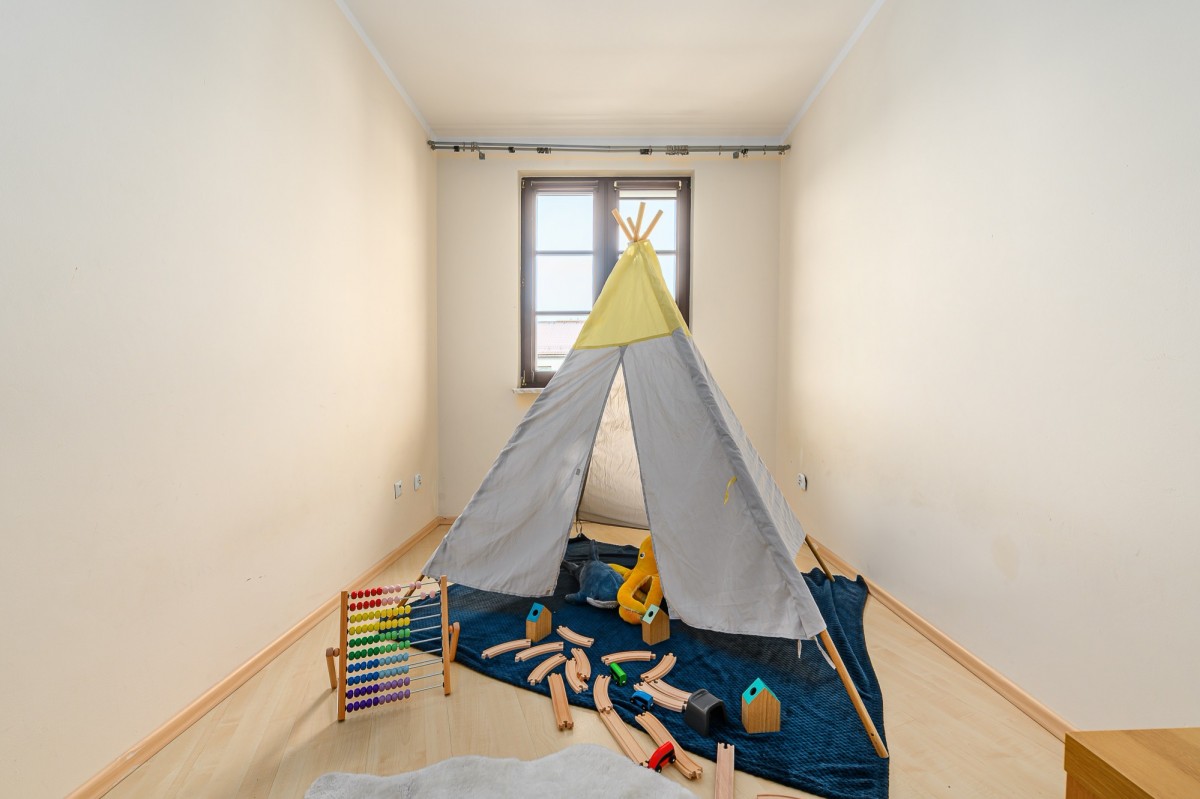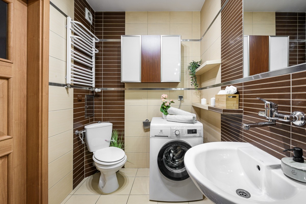 Mieszkanie składa się z przestronnego salonu z wyjściem na balkon oraz lekko odsuniętą w pełni wyposażoną kuchnią. W dalszej części mieszkania sypialnia oraz pokój dziecięcy/ gabinet. Dodatkowo do dyspozycji mamy dużą łazienkę wyposażoną w wannę, WC oraz oddzielna toaleta. Przedpokój z pojemnymi szafami do przechowywania rzeczy.
