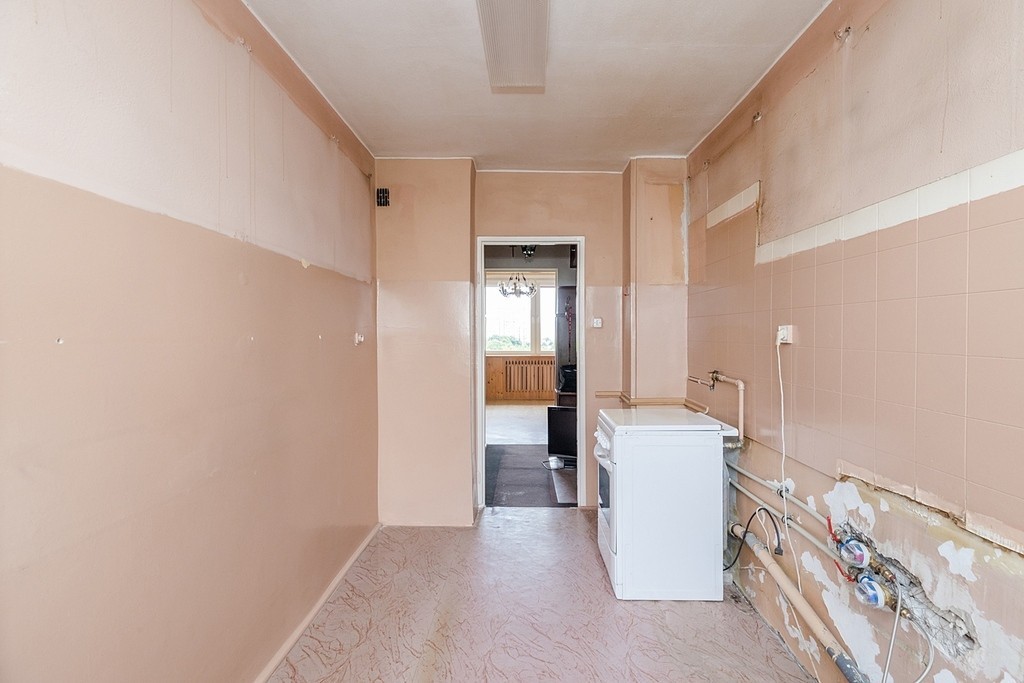 Mieszkanie jest dwustronne, jasne i funkcjonalne, jednak wymaga remontu, co daje możliwość wykończenia go według własnego gustu. W ogłoszeniu znajdują się zarówno zdjęcia aktualnego stanu, jak i wizualizacje poglądowe, które prezentują potencjał aranżacyjny wnętrz.