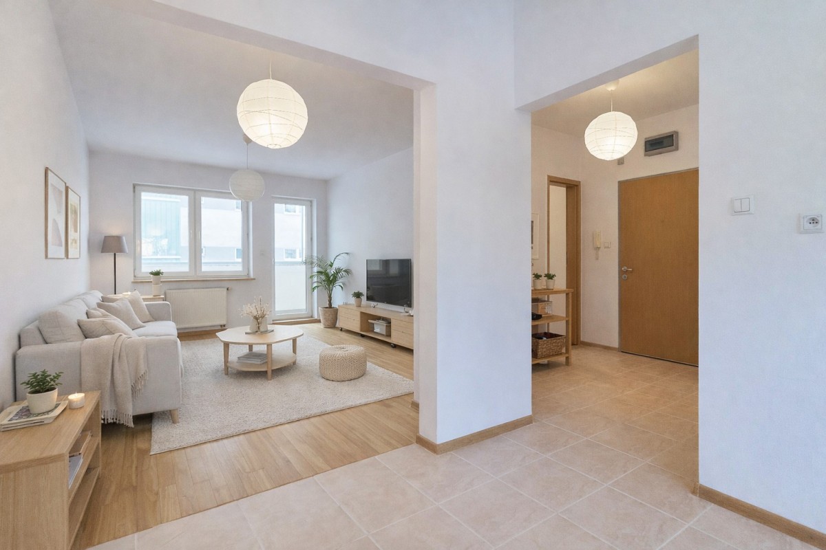 Istnieje możliwość przeniesienia kuchni do salonu (tworząc aneks kuchenny) i wydzielenia dodatkowego pokoju w miejscu obecnej kuchni. Mieszkanie może w łatwy sposób zyskać funkcjonalny, 3-pokojowy układ.