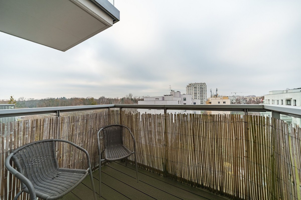 - Duży balkon wyposażony w stolik i krzesła – idealny do relaksu