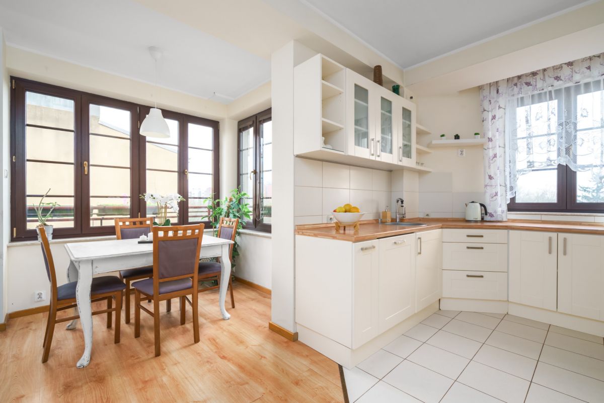 * Jadalnia o powierzchni 4,2 m² wyposażona w stół dla 4 osób, widok z okien na centrum Warszawy