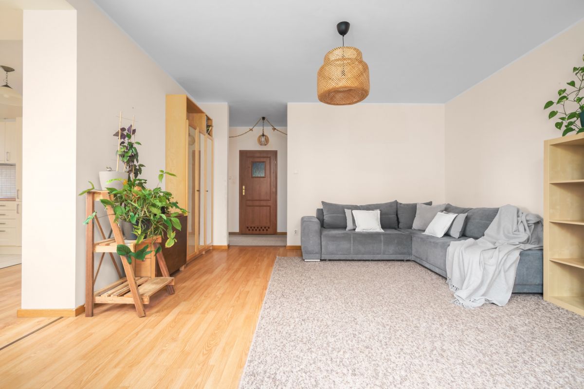 * Salon o powierzchni 23,2 m² z wygodną sofą, szafkami, TV