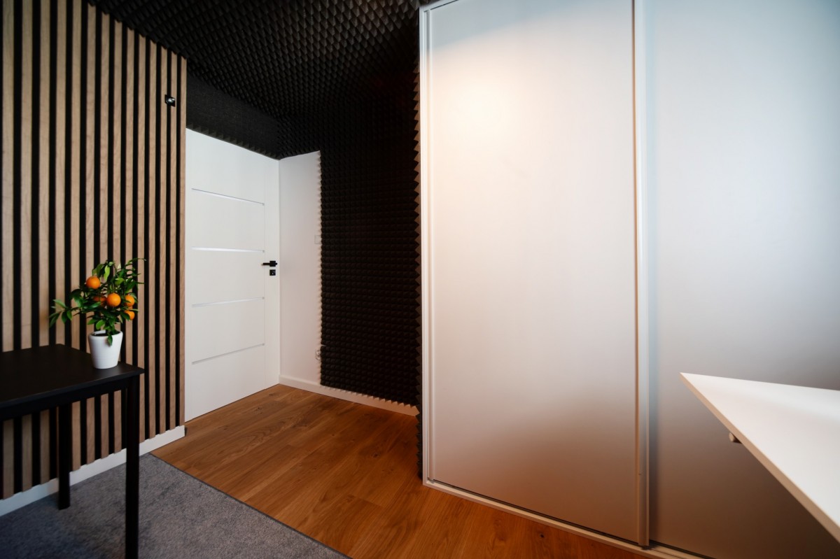 Mieszkanie składa się z trzech ustawnych pokoi, w tym przestronnego salonu o powierzchni 16 m² z aneksem kuchennym (4,82 m²), tworzących wygodną przestrzeń dzienną. W dwóch pokojach znajdują się praktyczne szafy wykonane na wymiar, co znacząco zwiększa funkcjonalność wnętrza.