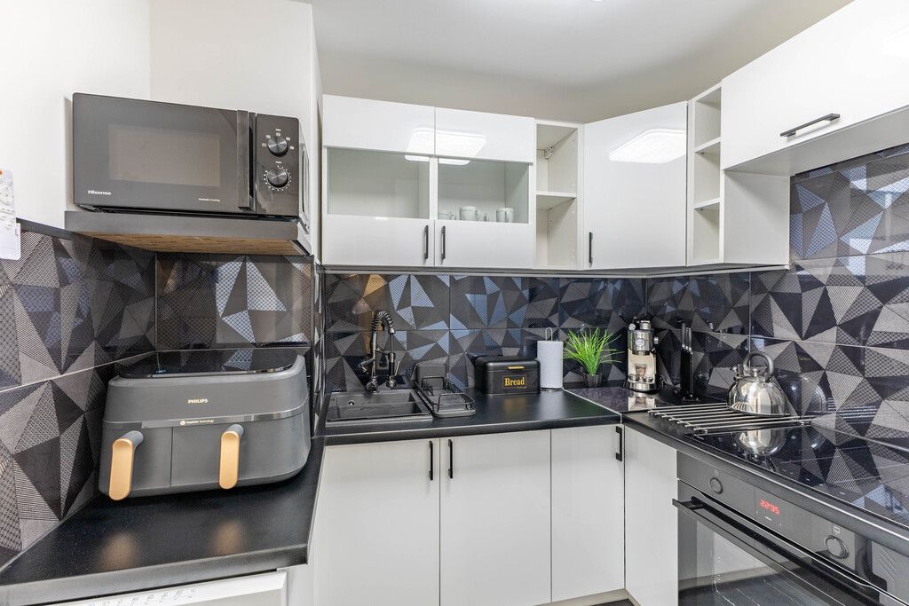– Oddzielna kuchnia z pełnym wyposażeniem: mikrofalówka, piekarnik, płyta grzewcza, zmywarka, lodówka, czajnik, a także komplet naczyń i sztućców,