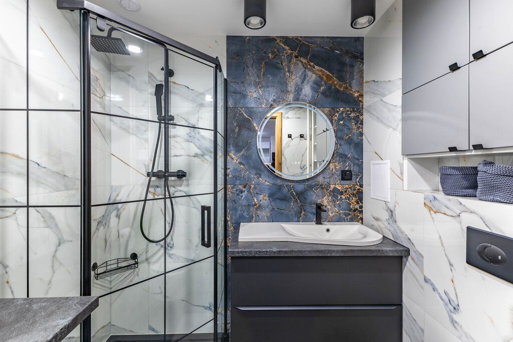 – Łazienka z dużą kabiną prysznicową i pralką – stylowa i funkcjonalna,