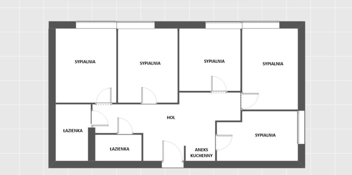 W ofercie znajdują się dwa poglądowe plany. Pierwszy z nich przedstawia obecny układ lokalu – 5 pokoi, drugi przedstawia układ pierwotny (salon z aneksem + 2 pokoje), do którego można po wyburzeniu ścianek działowych swobodnie powrócić. Plany mają charakter poglądowy, nie są to plany techniczne.