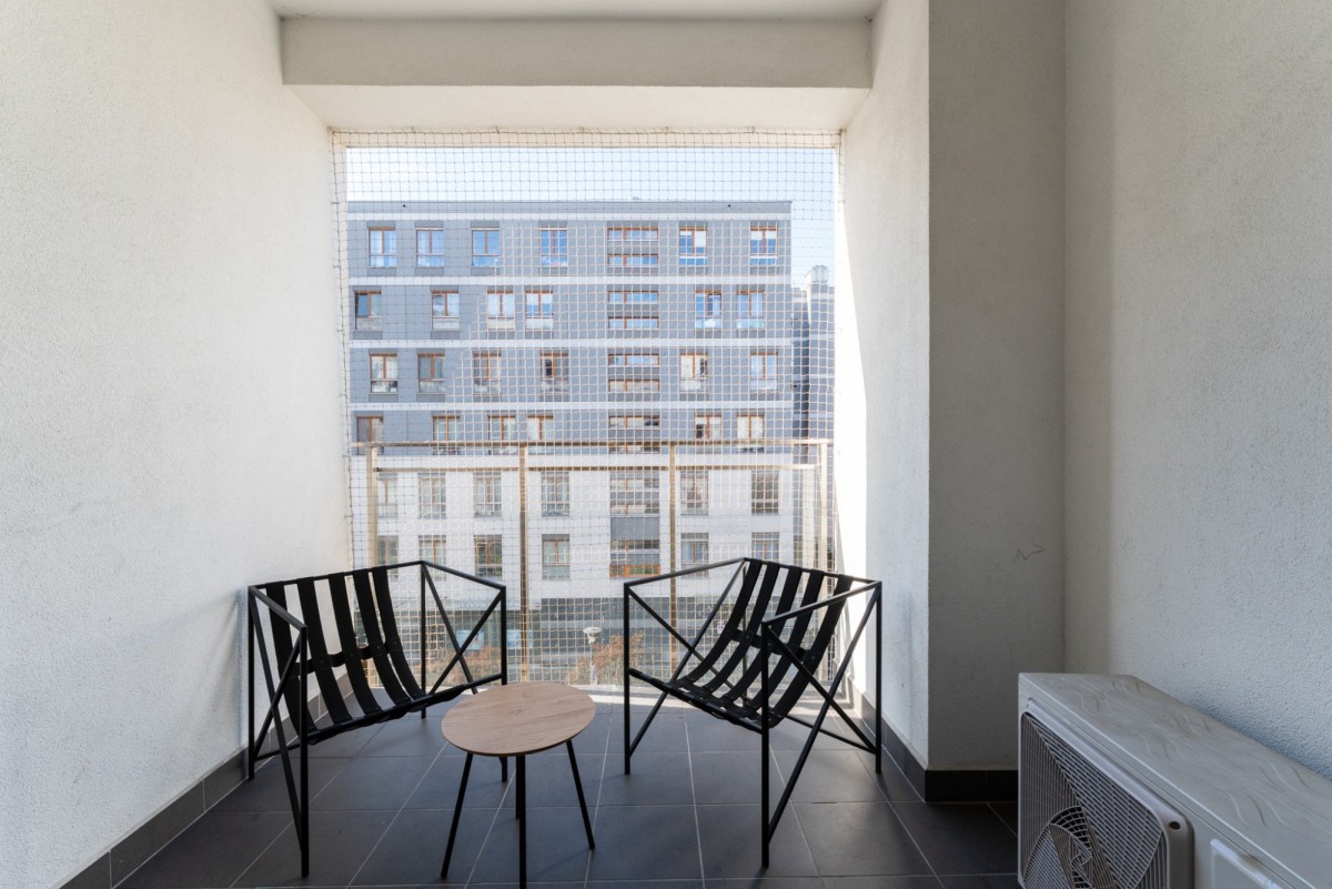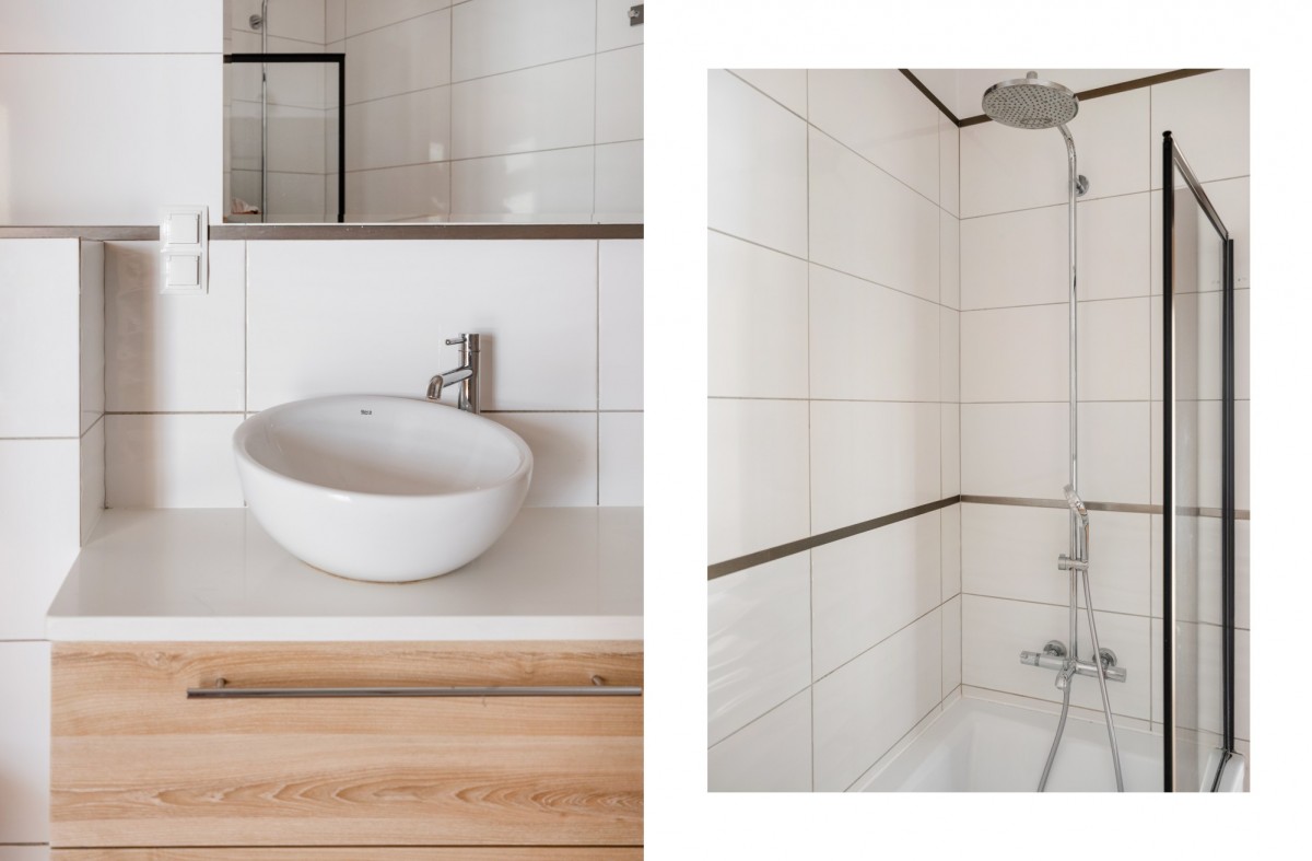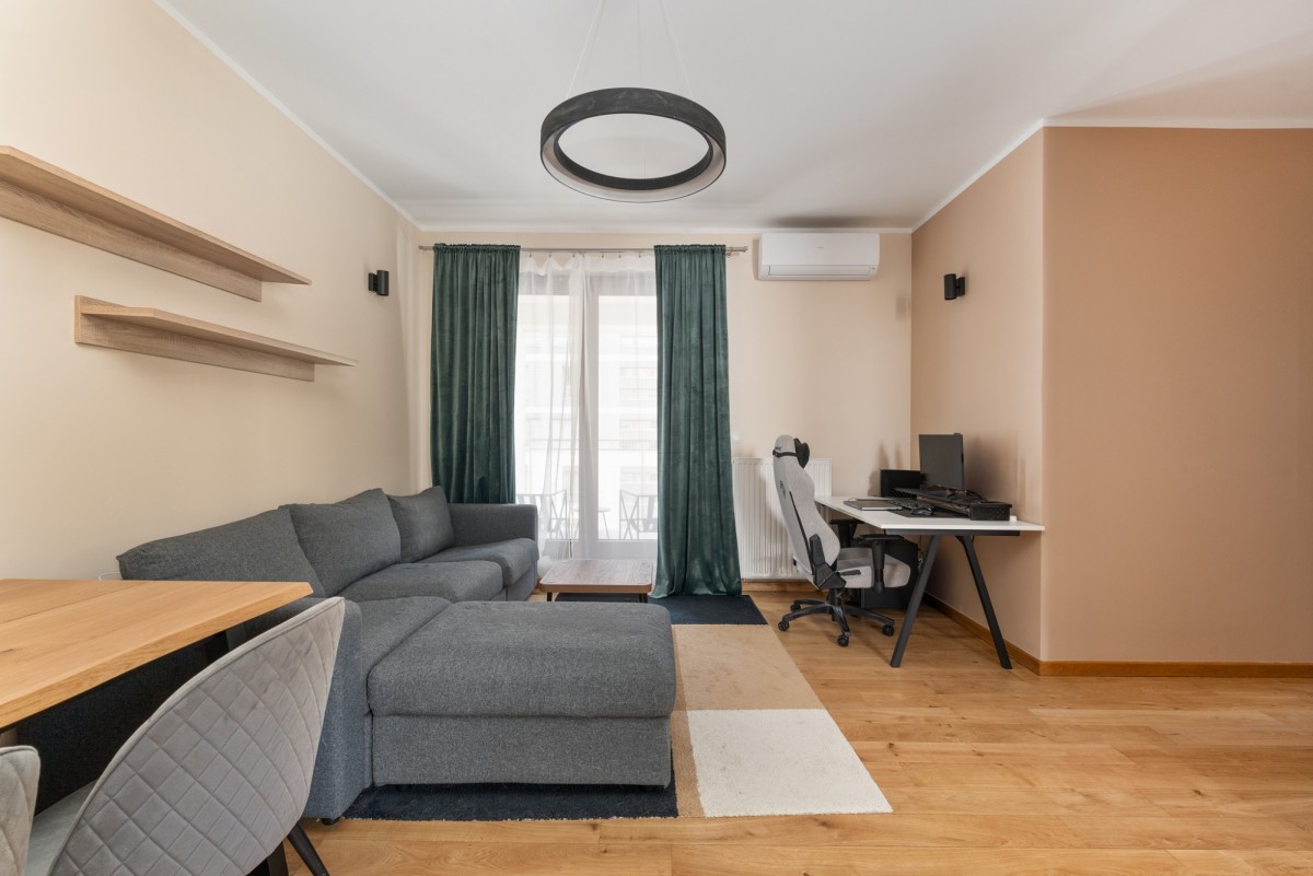 The apartment has an area of 76m2 and is located on the third floor. The living space consists of a living room and a fully equipped kitchen. From the living room we have access to the balcony, which overlooks the greenery. Additionally, a protective net for animals has been installed on the balcony. The private space consists of a master bedroom, a second room that can be arranged as a bedroom or a study, and a main bathroom. In addition, the apartment has a walk-in closet and a guest toilet.