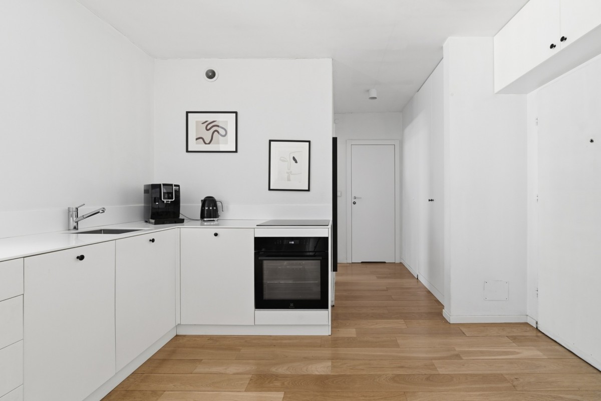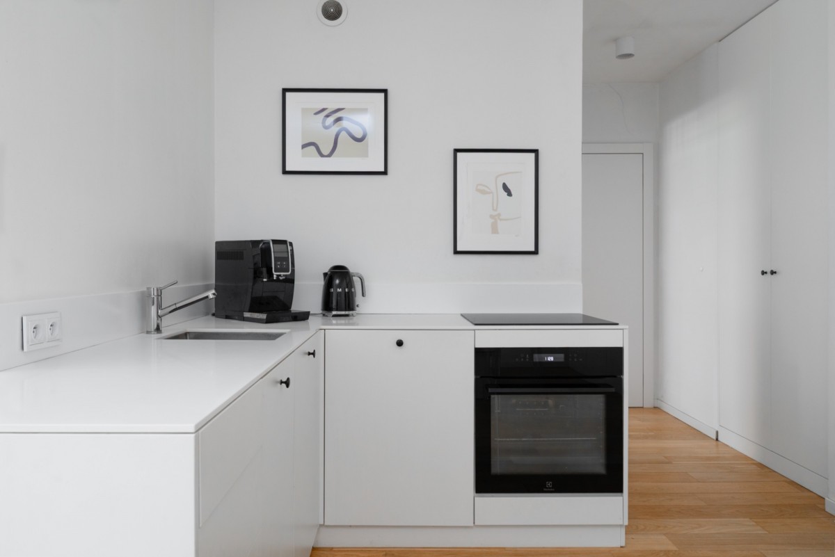 – salonu z aneksem kuchennym, zabudowanym meblami na wymiar z eleganckim blatem ze spieku oraz wyposażonym w sprzęt Electrolux i Bosch;