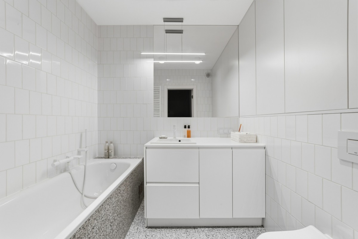 – łazienki po generalnym remoncie, wykończonej w stylu nowoczesnej elegancji — z terakotą Ornamenta, płytkami typu „metro”, wanną Kaldewei, armaturą Tres oraz pralko-suszarką Electrolux.