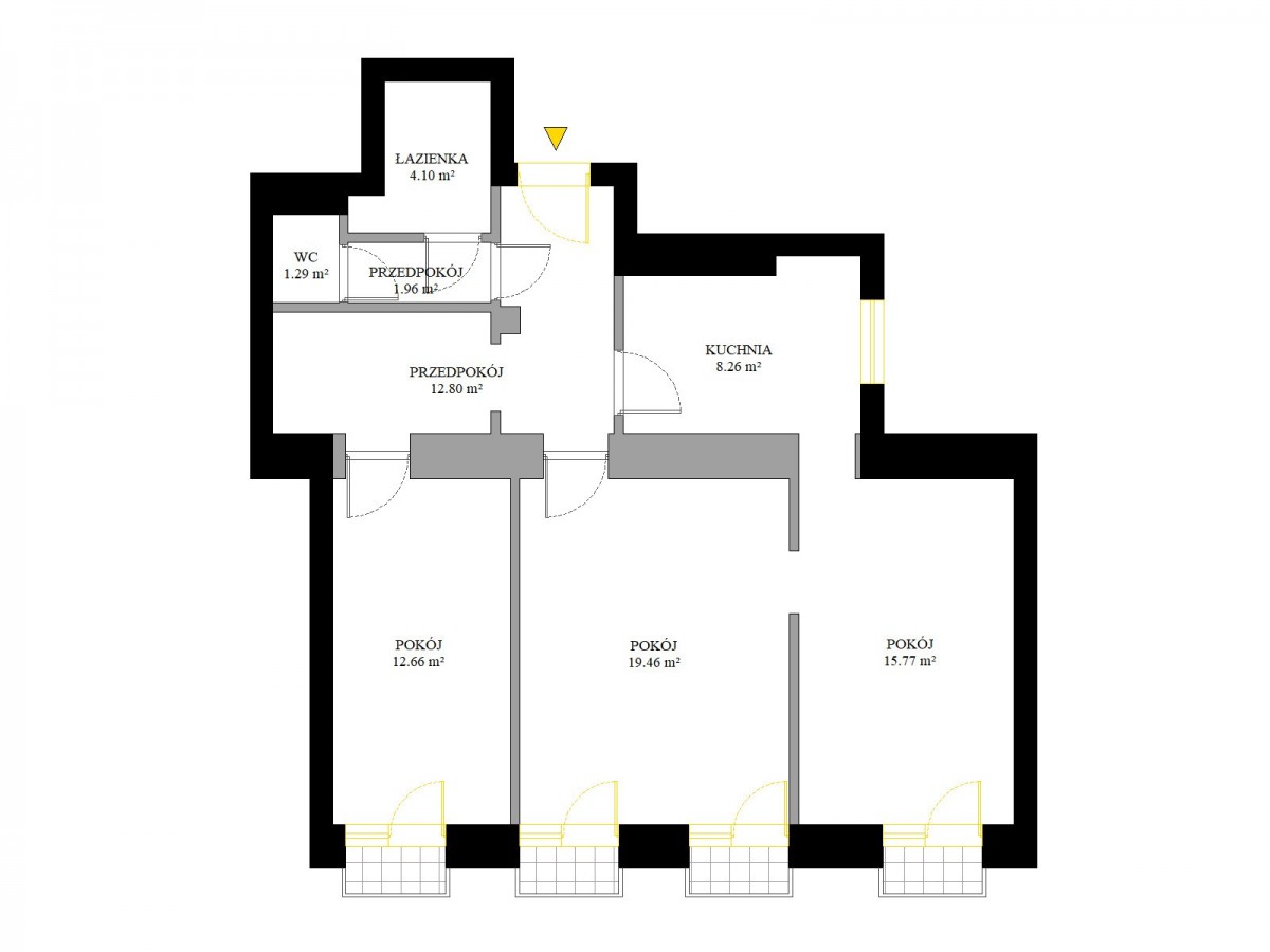 Mieszkanie składa się z 3 pokoi, oddzielnej kuchni, obszernego przedpokoju, osobnej toalety oraz łazienki. Do mieszkania przypisana jest komórka lokatorska.