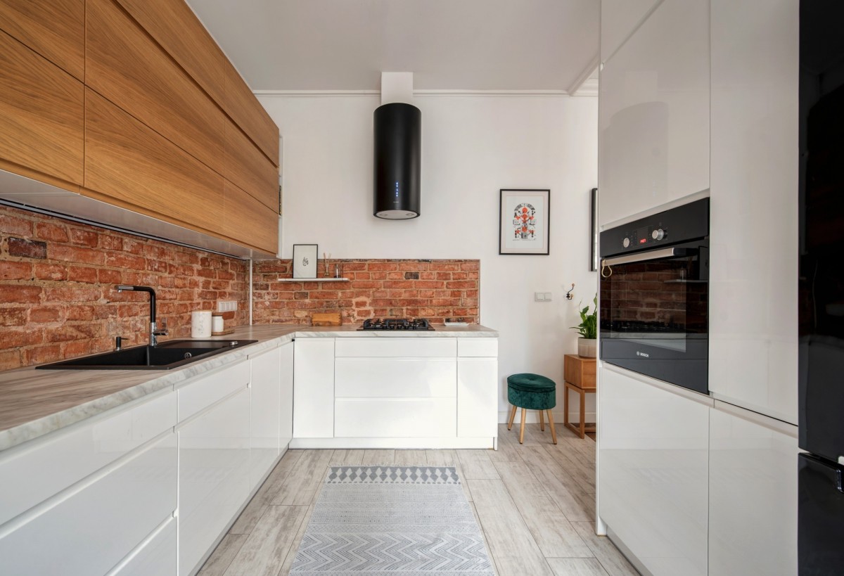 The apartment impresses with its spaciousness from the very beginning. It consists of a large living room and a balcony connected to the dining area and kitchenette. White walls visually enlarge the space, brickwork in the kitchen and wooden finishes add warmth, and carefully selected Scandinavian-style accessories give it an exclusive character. To the left of the entrance, we enter an equally bright private space, featuring a large bedroom with a balcony, a walk-in closet, a bathroom, and a children’s room, which can also be used as a study or a second bedroom. It’s worth noting that the apartment includes a parking space right next to one of the balconies.