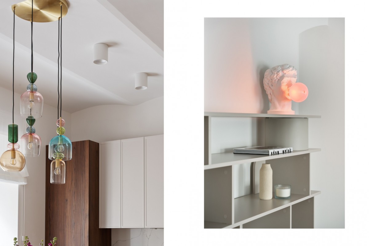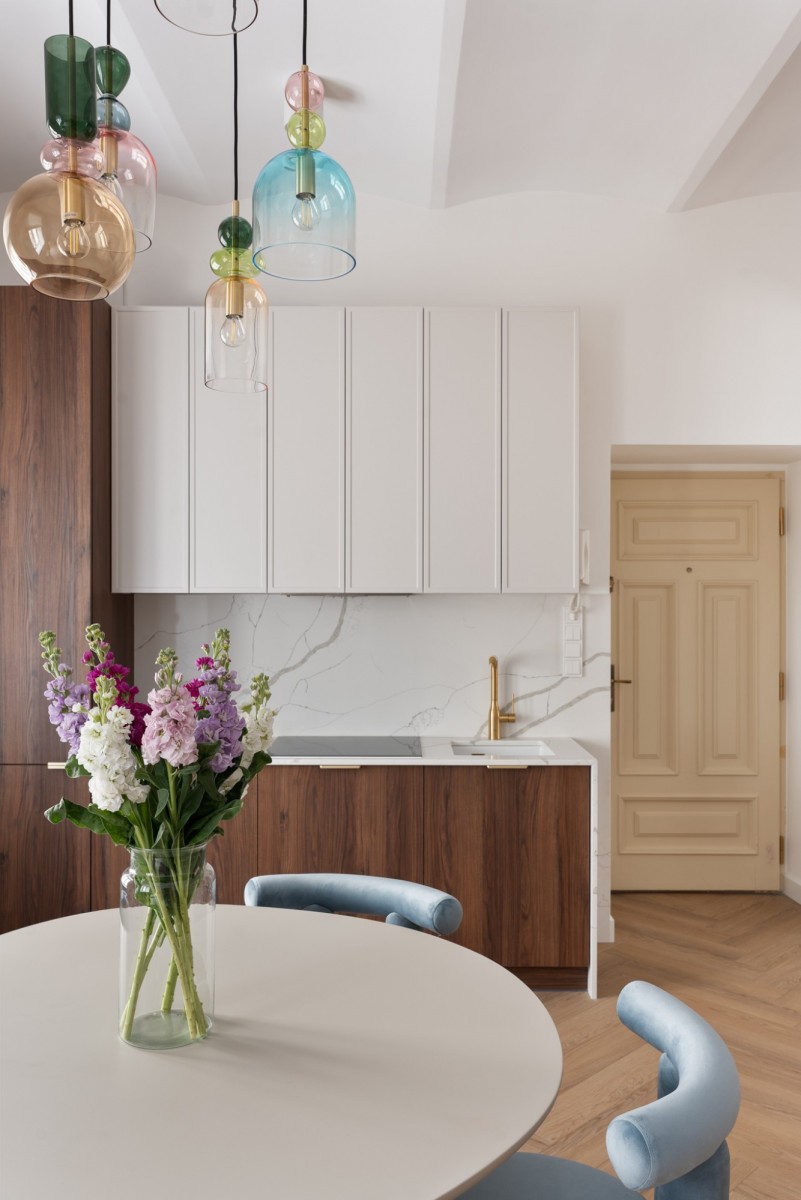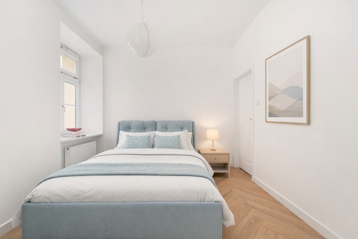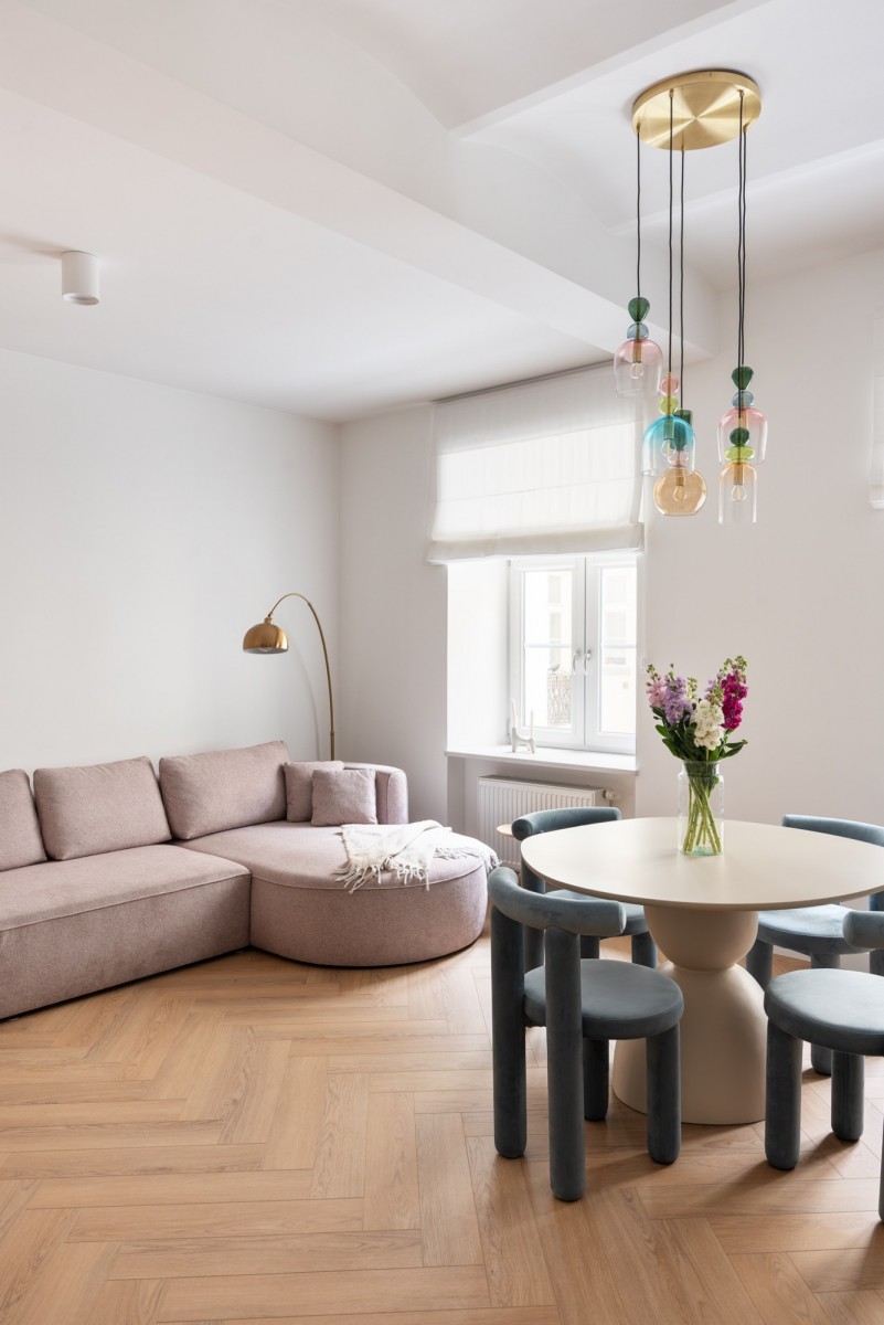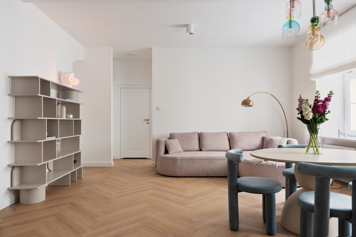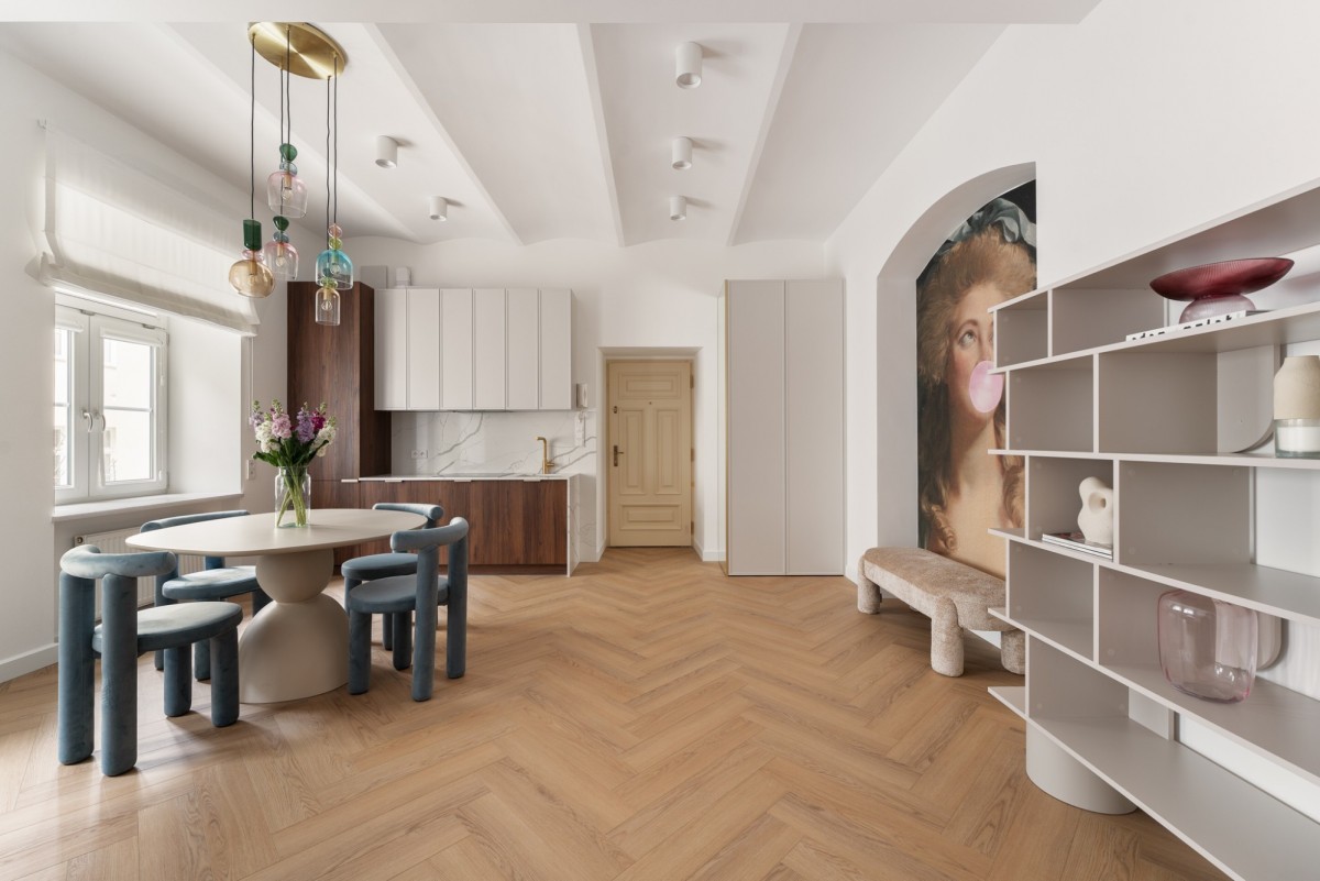 Mieszkanie zostało wykończone w najwyższym standardzie, z drewnianą podłogą ułożoną w jodełkę. Wnętrze jest klimatyczne i spójne stylistycznie.