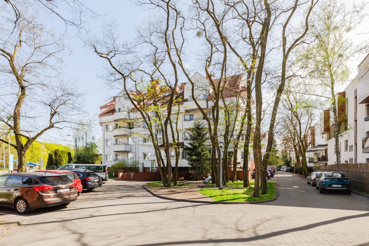Mieszkanie jest usytuowane w ogrodzonym budynku z zielonym terenem wokół. Oferuje miejsce parkingowe w strefie ogólnodostępnej. Czynsz administracyjny wynosi około 1100 zł miesięcznie.