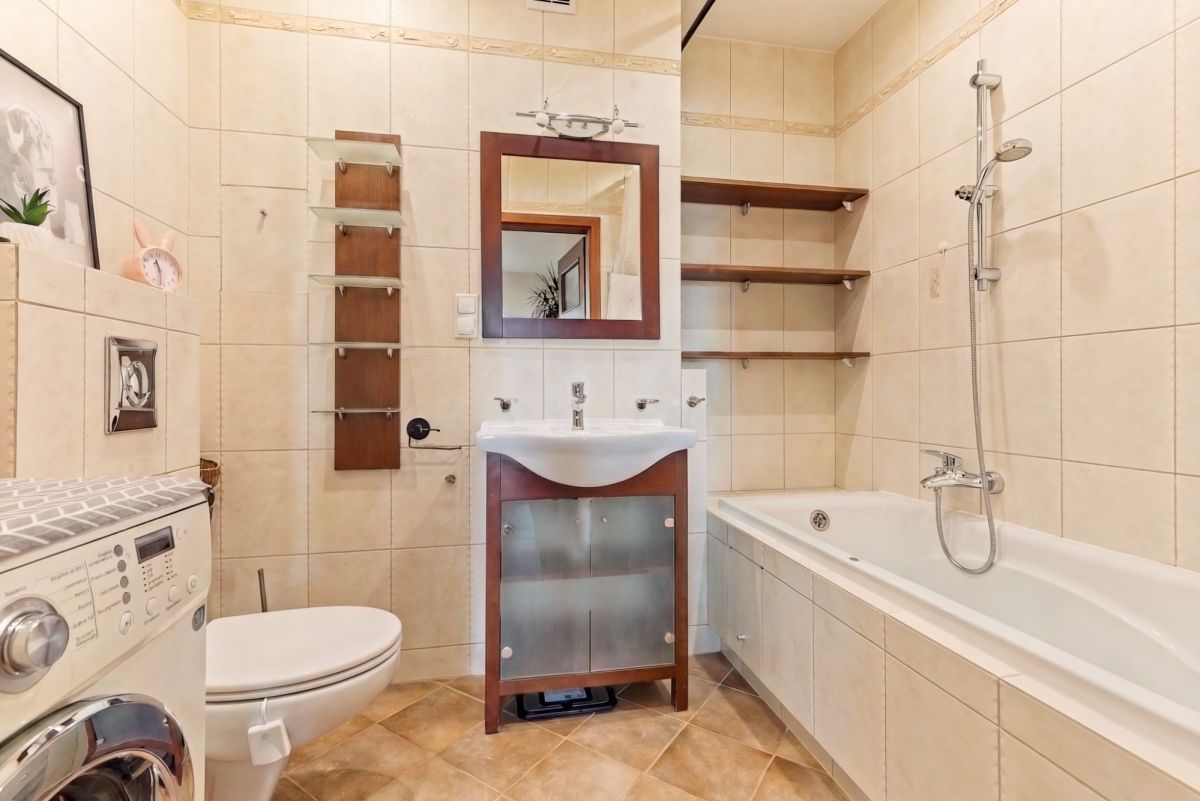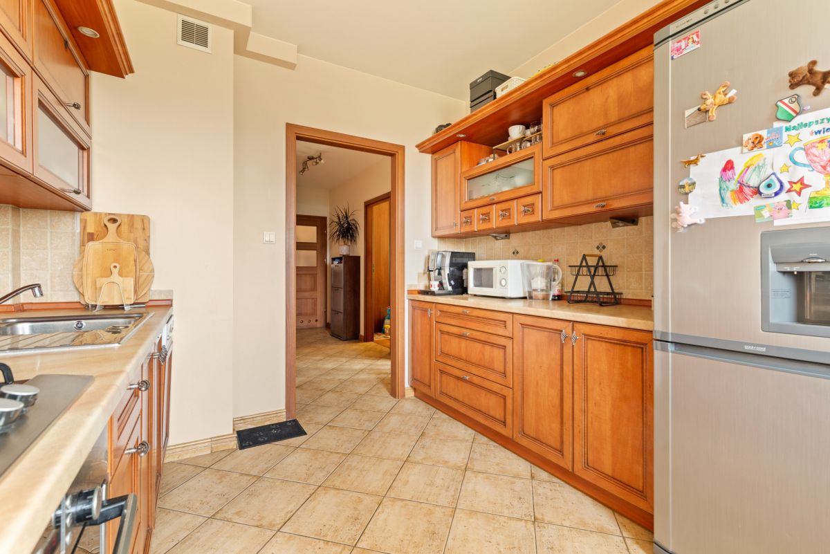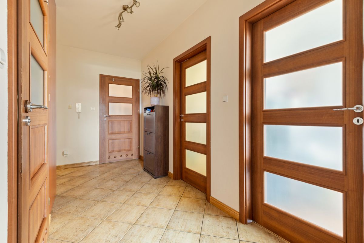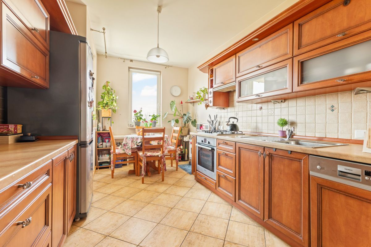 W mieszkaniu na podłogach znajdują się panele oraz terakota. Dużym atutem mieszkania jest zachodnia ekspozycja salonu oraz kuchni w pięknym widokiem na stadninę koni oraz panoramę Warszawy. Mieszkanie rozkładowe, słoneczne z dużym balkonem.
