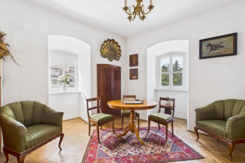 – obszerny salon z wyjściem na spry balkon. Wyposażony w rozkładaną kanapę, stół z 4 krzesłami, kredens, szafkę pod TV,