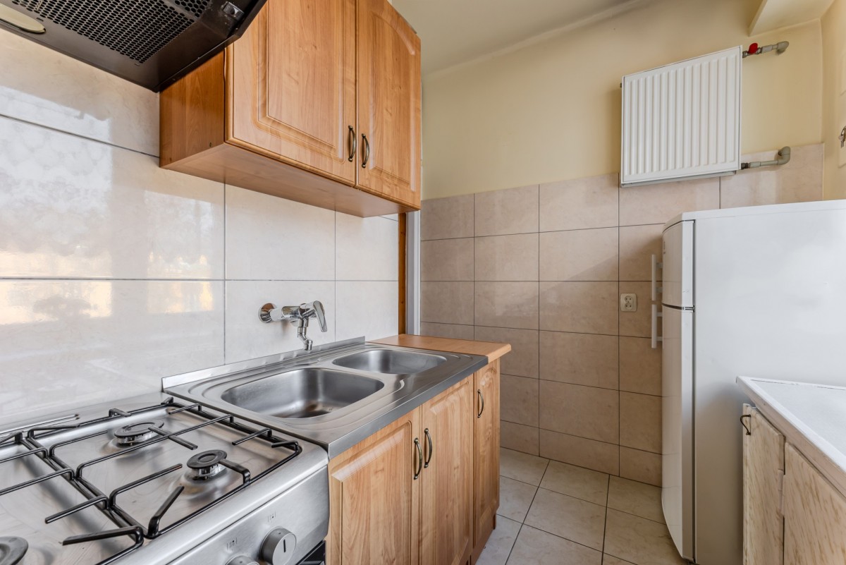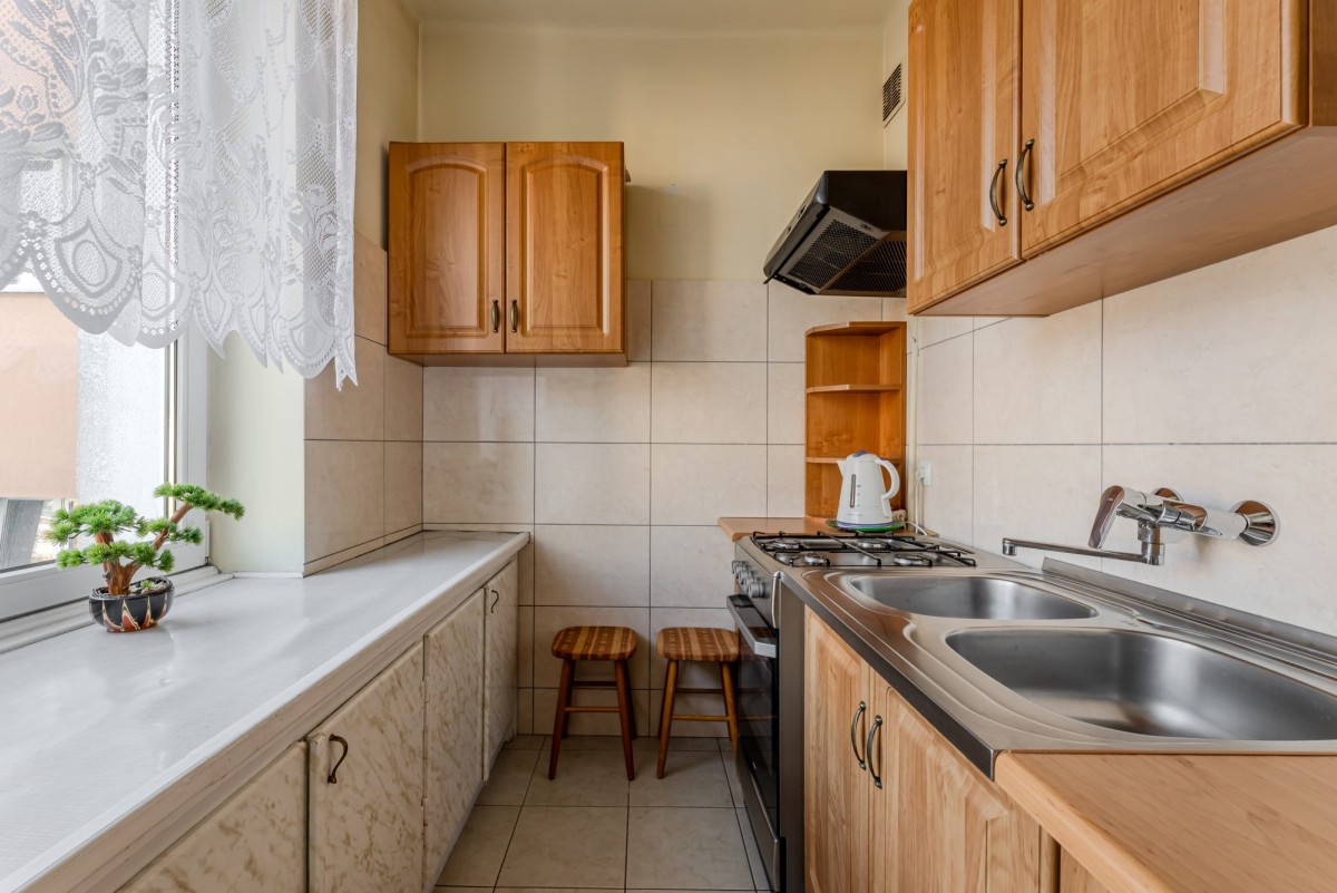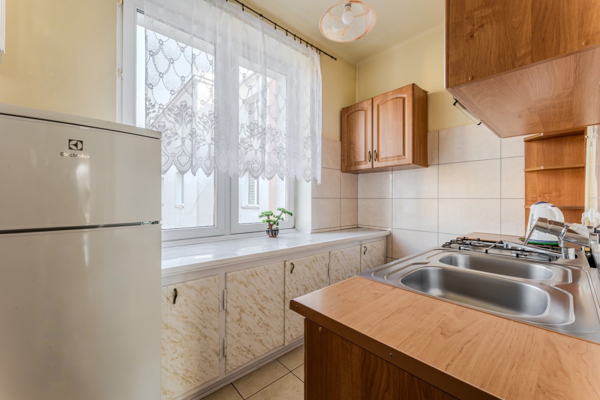 – oddzielnej kuchni z oknem z ekspozycją na północ i widokiem na zielone, ciche patio, wyposażonej w zabudowę szafkową, lodówkę , kuchnie gazowo-elektryczną.