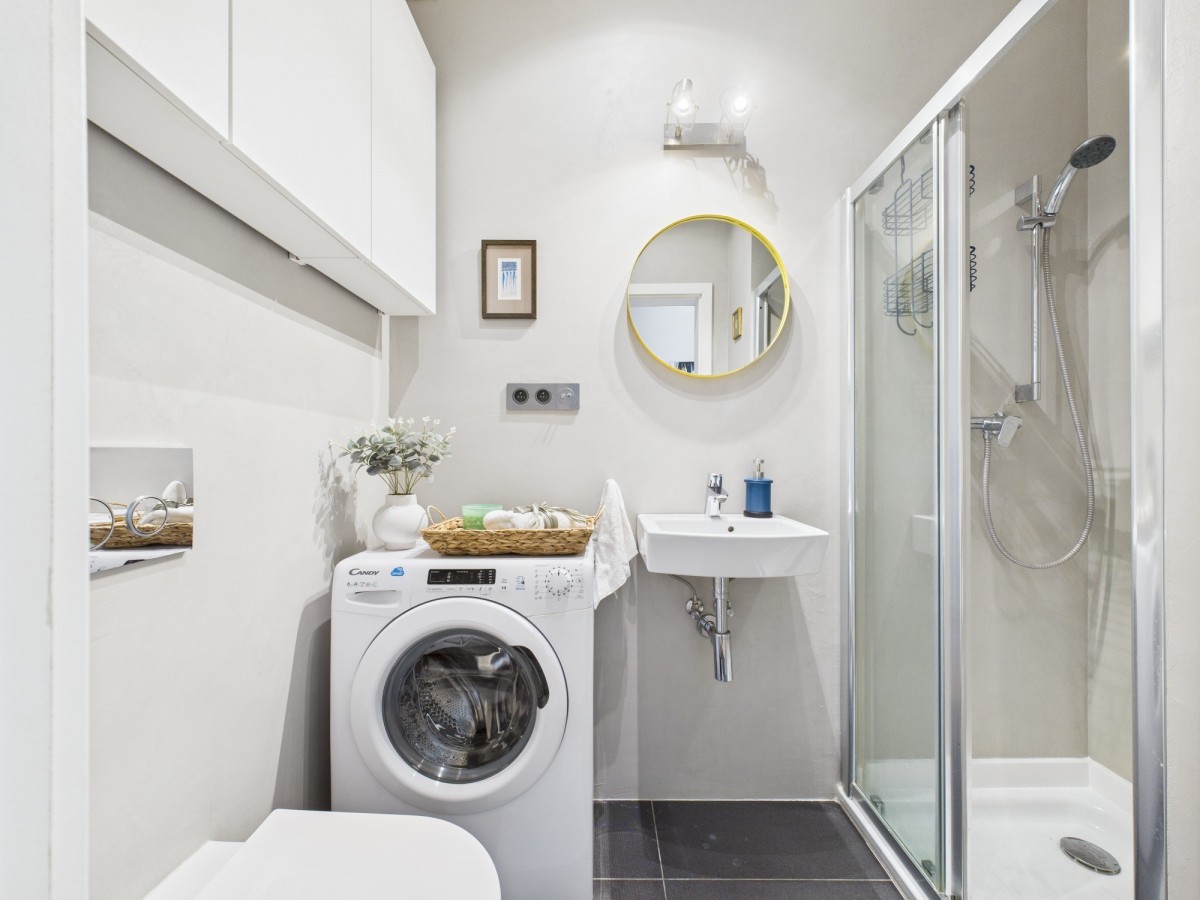 - Łazienka (ok. 5 m2) wyposażona w prysznic i pralkę,