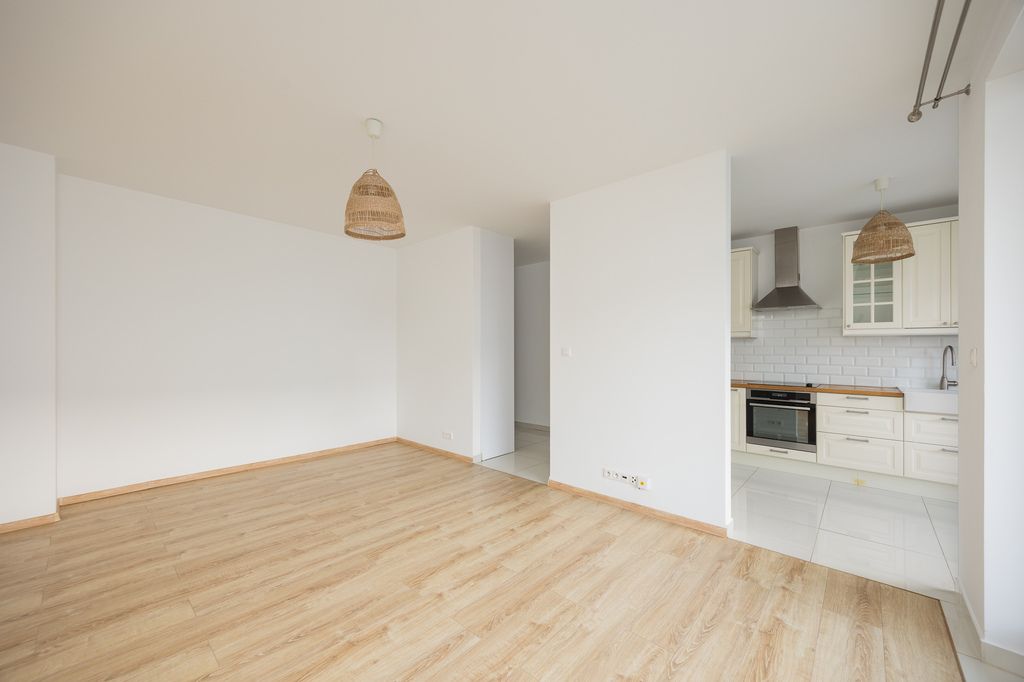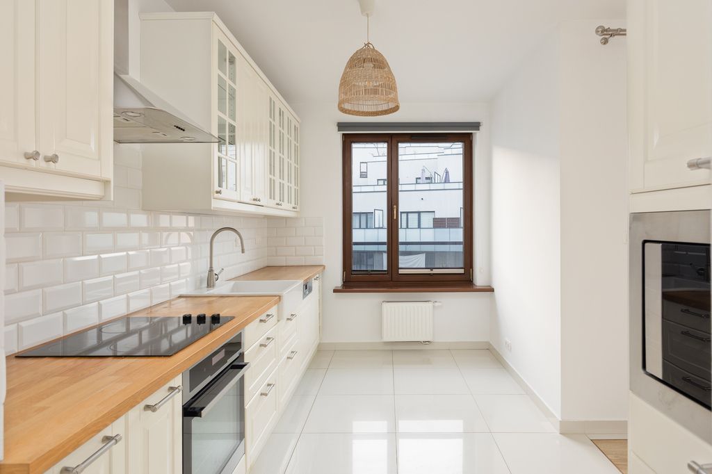 Mieszkanie jest w bardzo dobrym stanie technicznym, świeżo odświeżone i odmalowane. Wnętrze wykończone jest w ponadczasowym standardzie, z panelami oraz gresem na podłogach. W łazience znajduje się prysznic. Nowoczesne drewniane okna skierowane są na zachód, dzięki czemu mieszkanie jest dobrze doświetlone i pozostaje ciche, ponieważ wychodzi na wewnętrzne patio.