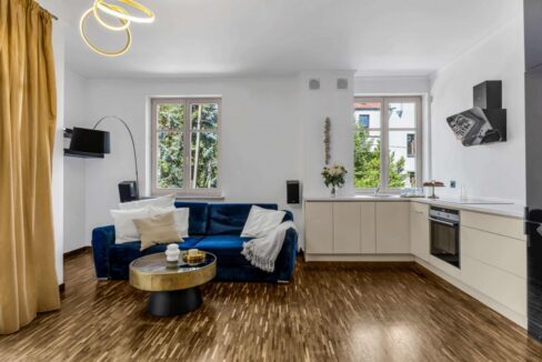 Apartament został zaprojektowany z myślą o komforcie i funkcjonalności. Jasne wnętrza, duże przeszklenia oraz bezpośrednie wyjście do ogrodu tworzą idealną przestrzeń do życia.