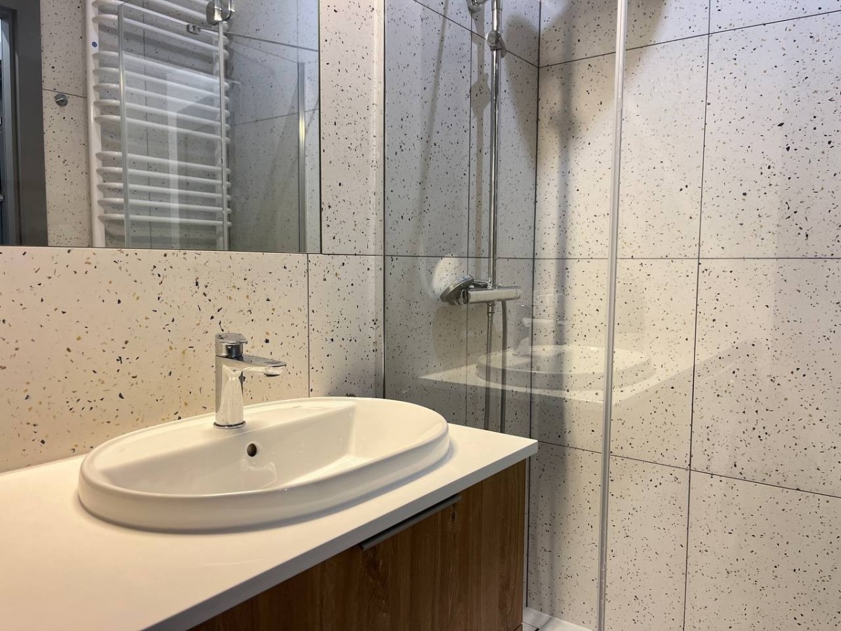 Jednym z największych atutów mieszkania jest duża loggia, która stanowi naturalne przedłużenie strefy dziennej i daje dodatkową przestrzeń do wypoczynku. Wnętrze doświetlają drewniane okna trzyszybowe o podwyższonej izolacji termicznej, wyposażone w filtry antysmogowe, a w każdym pokoju zamontowano zewnętrzne rolety antywłamaniowe.