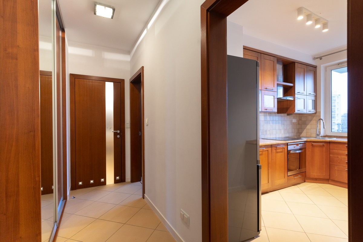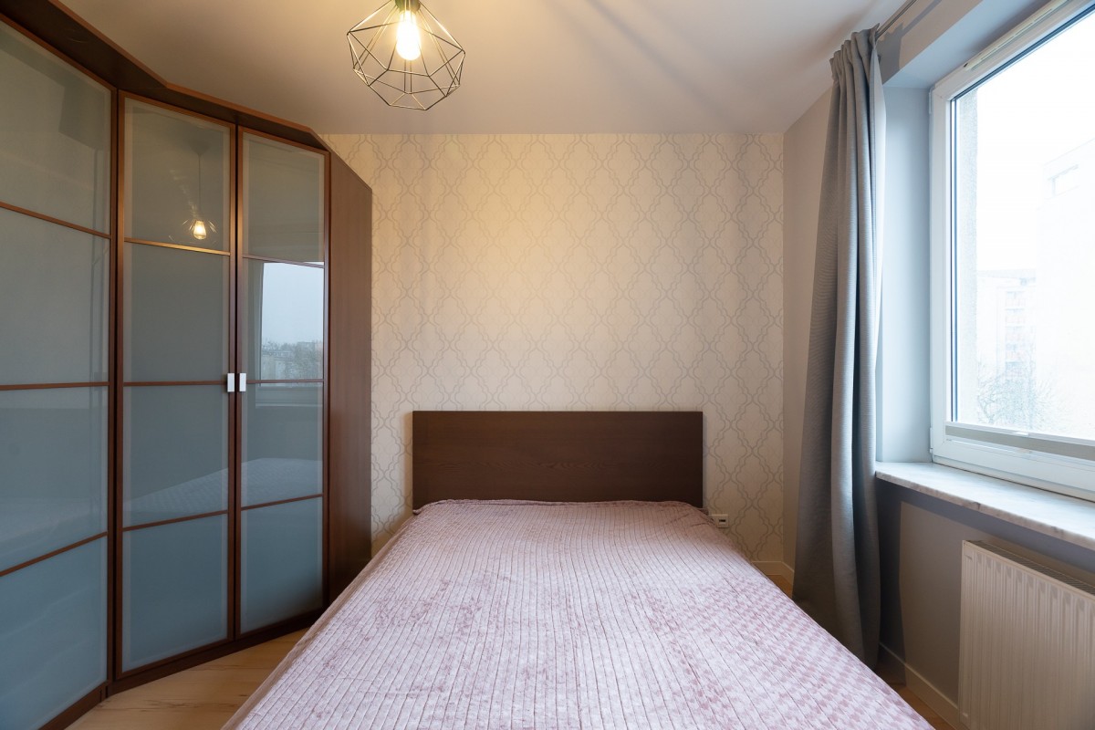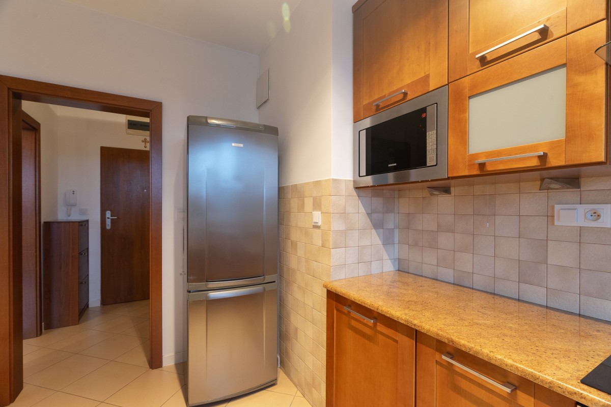 W pokoju dziennym rozkładana kanapa, duży stół, w sypialni dwuosobowe łóżko i duża szafa w zabudowie. W przedpokoju duża szafa. W łazience kabina prysznicowa, umywalka, WC i szafa. W kuchni meble w zabudowie, lodówka z zamrażarką, zmywarka, pralka, kuchnia indukcyjna z piekarnikiem.