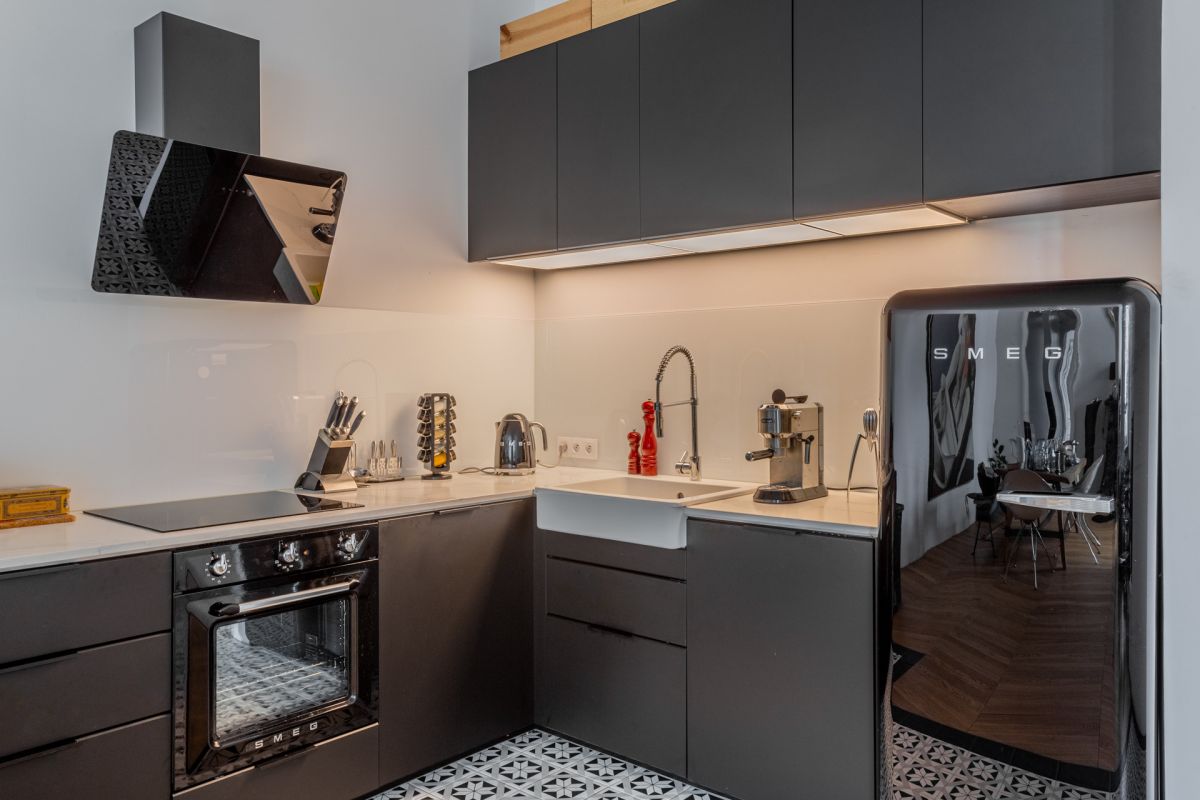 * Aneks kuchenny – otwarty na jadalnię i salon, nowoczesny i w pełni wyposażony w sprzęty AGD, w tym lodówkę na wino. Stanowi integralną część przestrzeni dziennej,