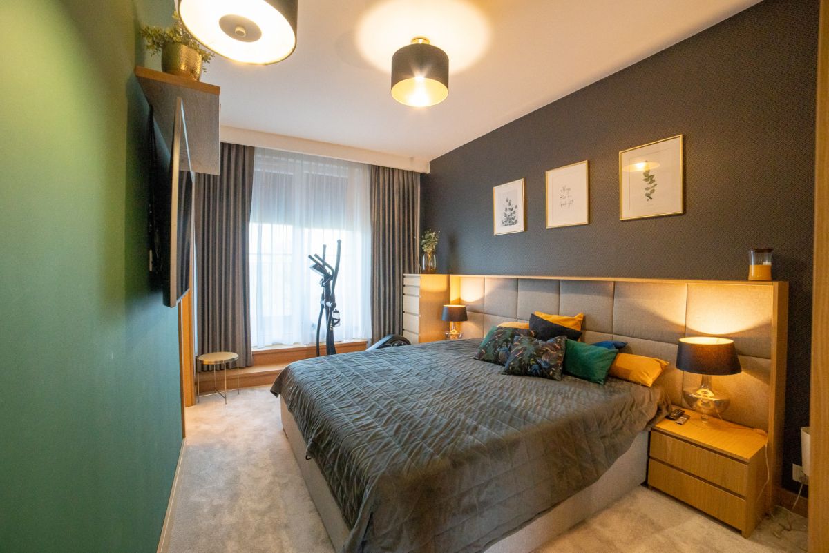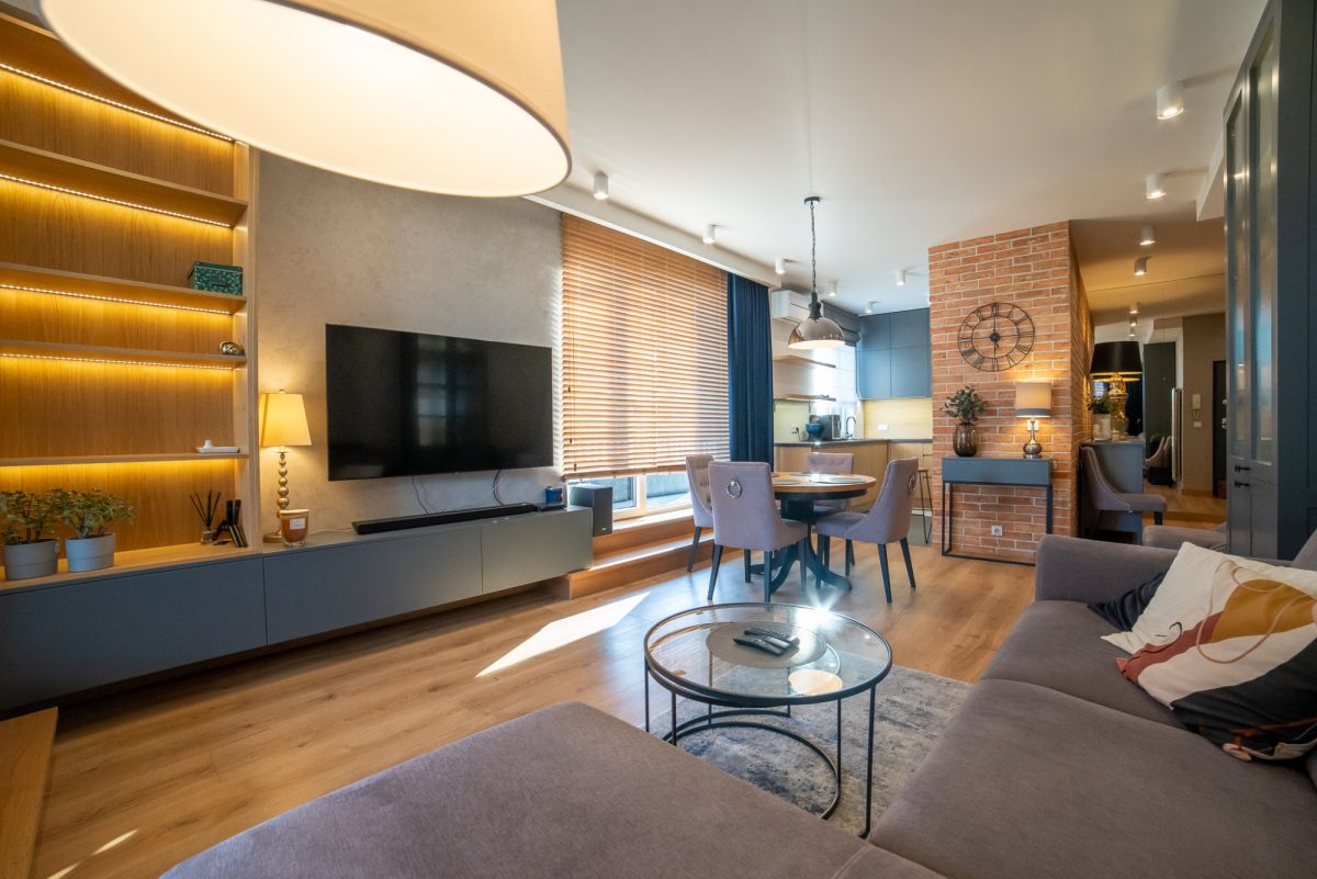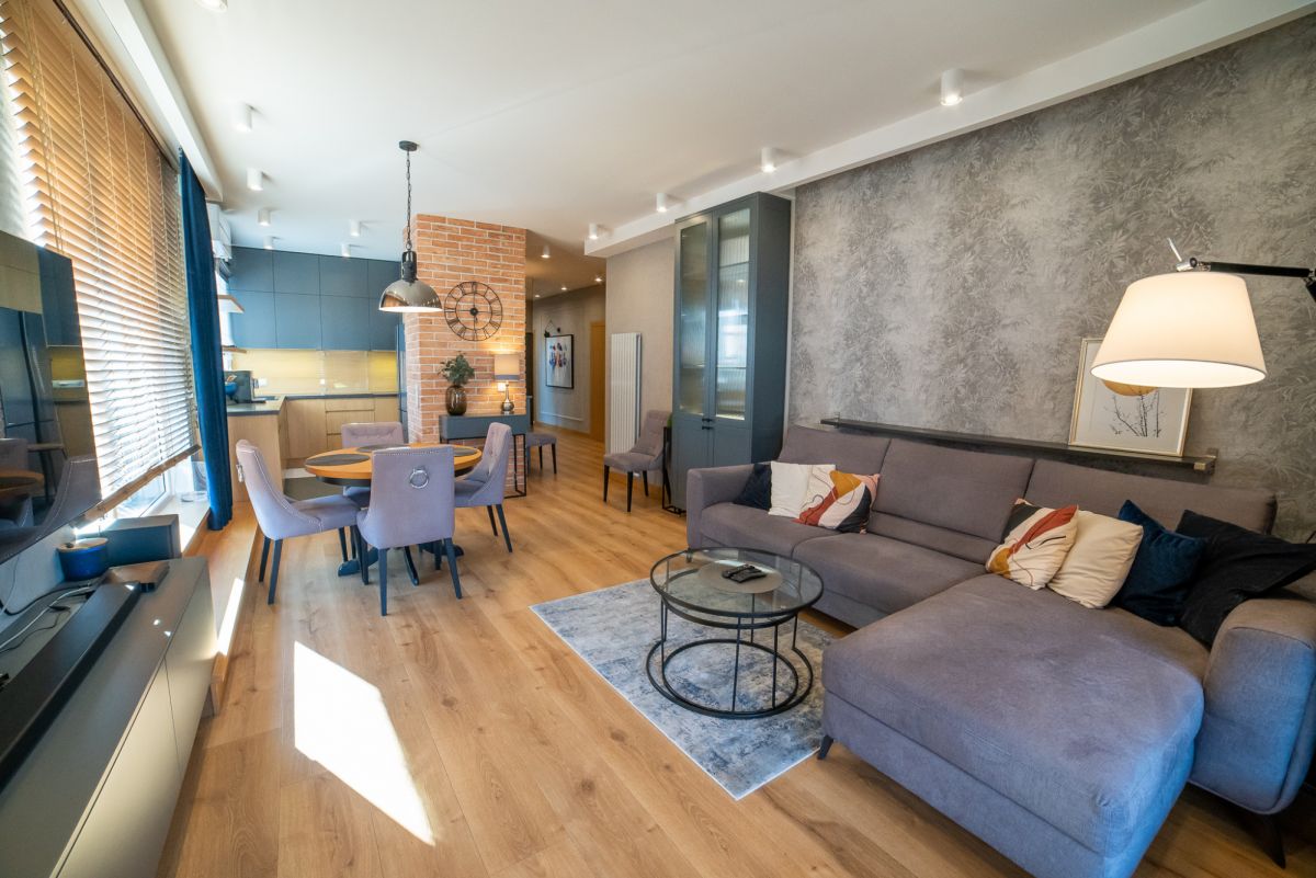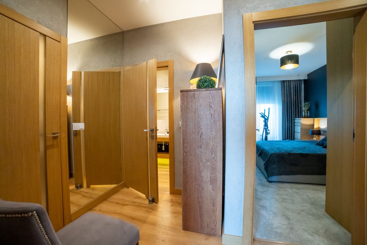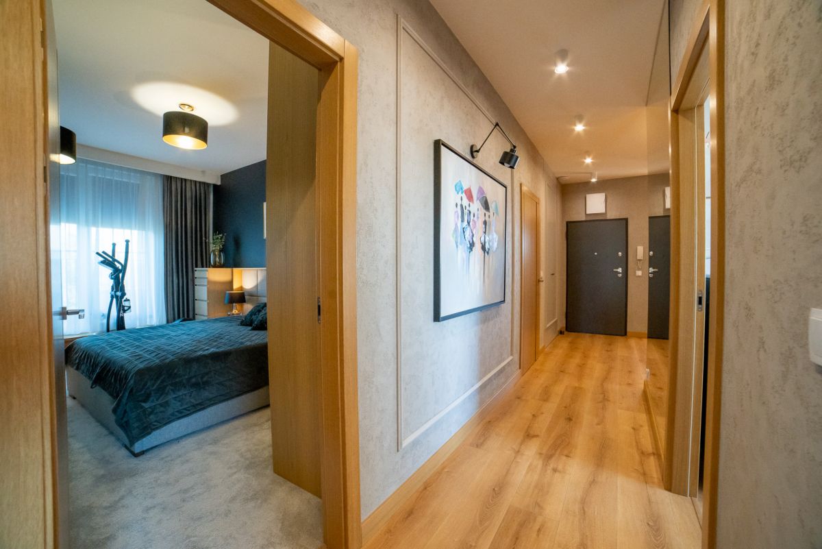 Wnętrze zostało wykończone w bardzo wysokim standardzie – większość zabudowy meblowej wykonana na zamówienie. Całość jest w pełni umeblowana i wyposażona w sprzęt AGD. Dodatkowym atutem jest klimatyzacja dostępna w całym mieszkaniu.