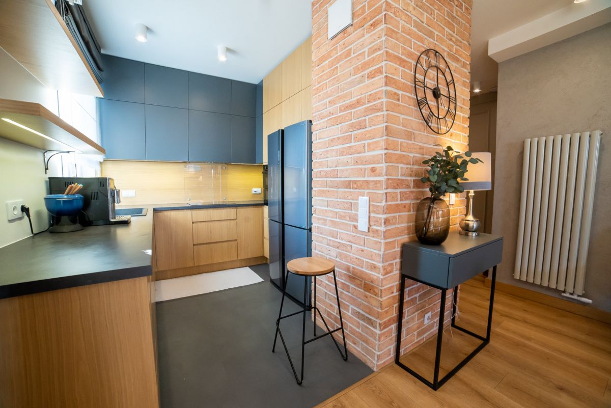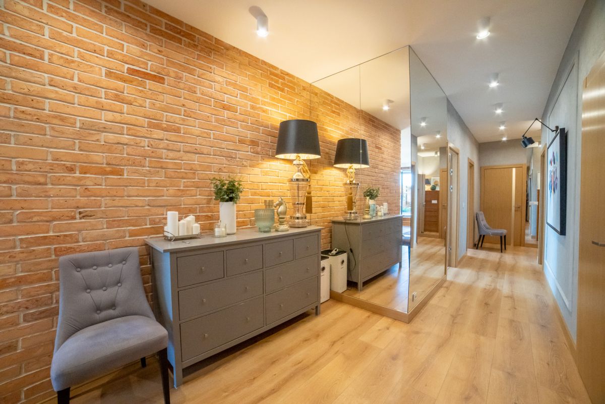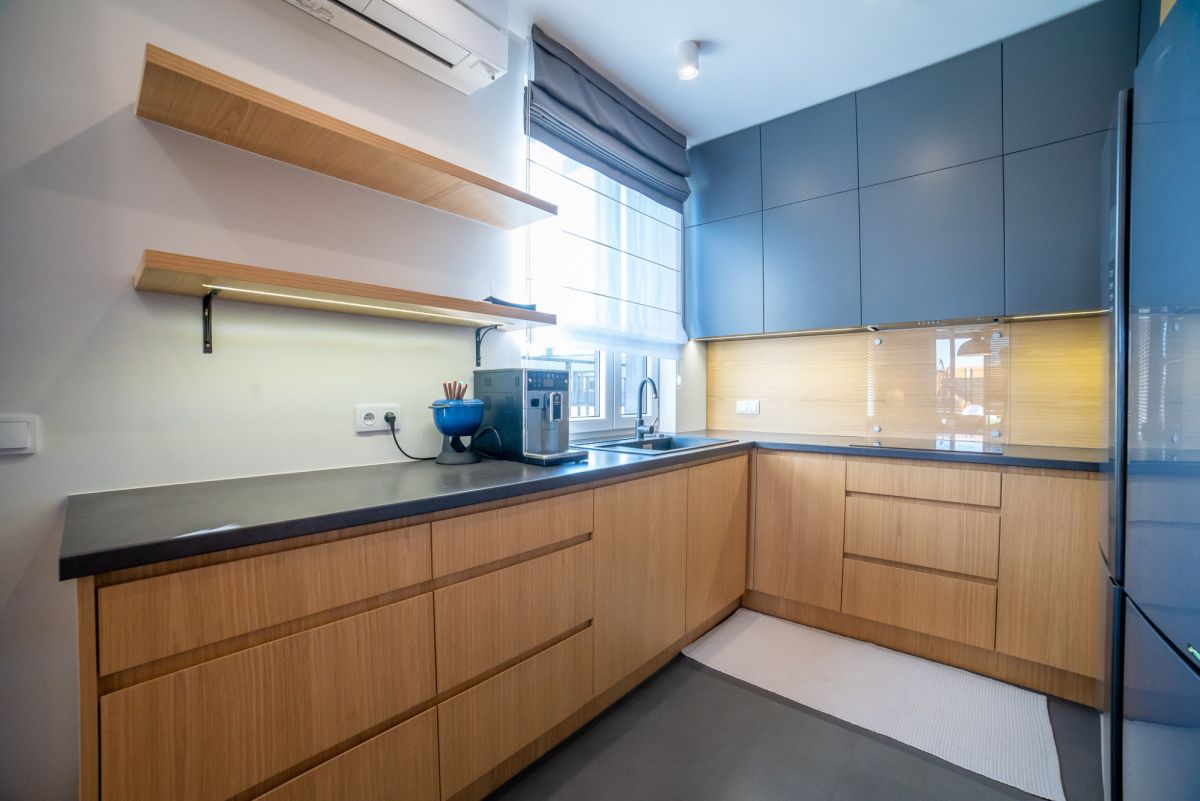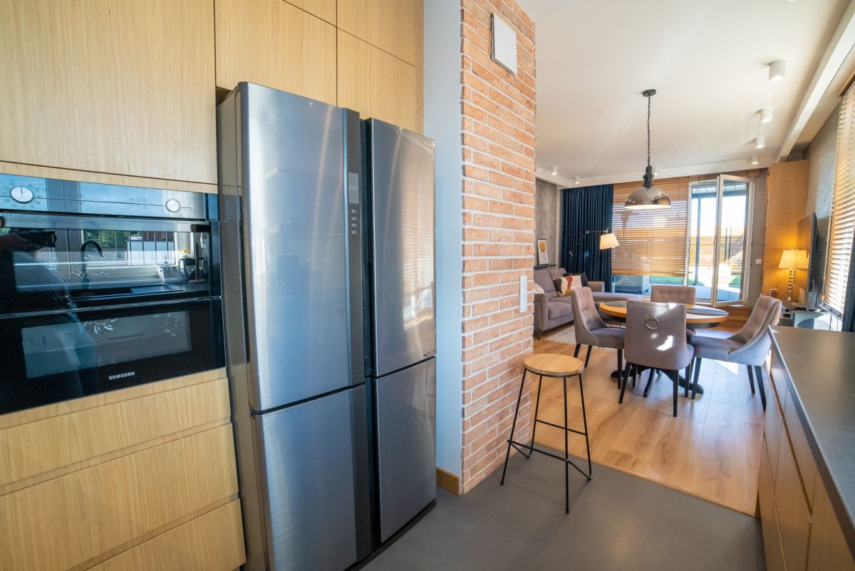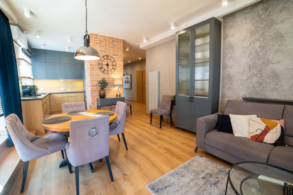 Wnętrze zostało wykończone w bardzo wysokim standardzie – większość zabudowy meblowej wykonana na zamówienie. Całość jest w pełni umeblowana i wyposażona w sprzęt AGD. Dodatkowym atutem jest klimatyzacja dostępna w całym mieszkaniu.
