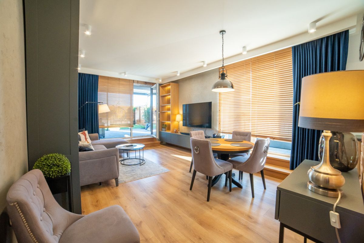 * Salon z wyjściem na duży taras z ogródkiem,