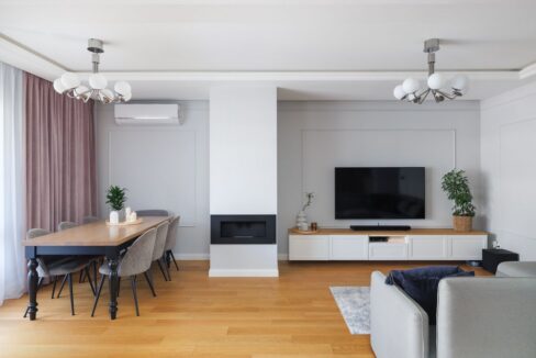 Wnętrza zostały wykończone z dbałością o detale i funkcjonalność. W salonie oraz na klatce schodowej zastosowano elegancką deskę podłogową, która dodaje wnętrzom ciepła i naturalnego charakteru. W pozostałych pomieszczeniach znajdują się panele oraz praktyczny gres, idealny do intensywnie użytkowanych stref.