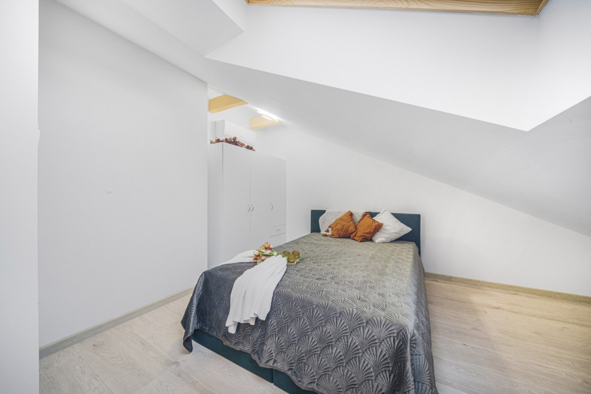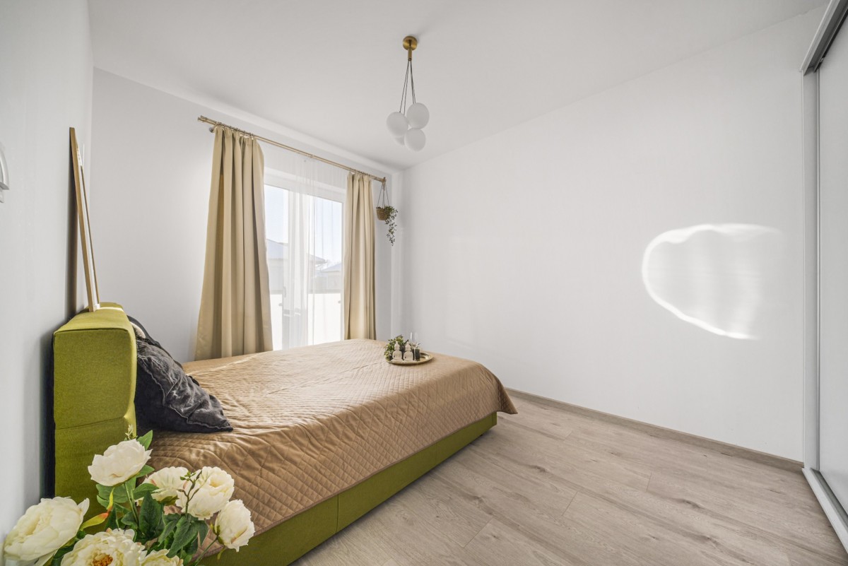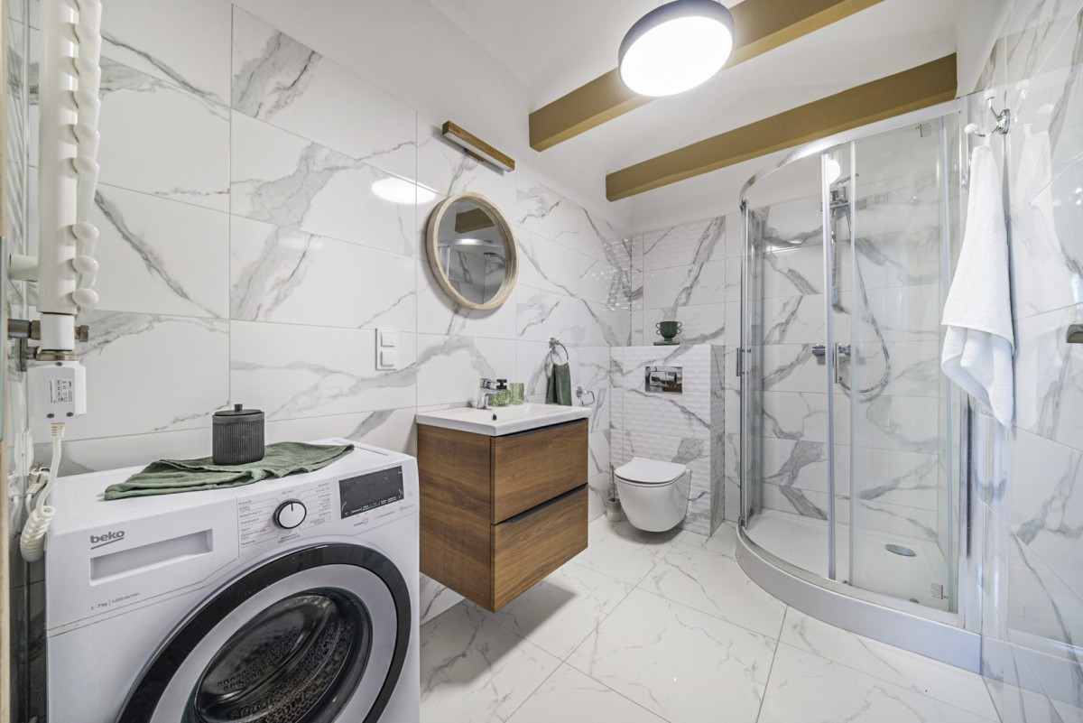 Pierwsze piętro to gotowa do zamieszkania przestrzeń, salon z w pełni wyposażonym aneksem kuchennym, dwie przytulne sypialnie z pojemnymi szafami i dużą łazienka. Nie zapominajmy o tarasie!