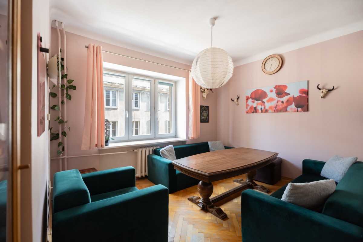 * 4 ustawnych pokoi, dwa pokoje usytuowane są od strony wschodniej z widokiem na ul. Mazowiecką, kolejne dwa pokoje znajdują się po stronie zachodniej z widokiem na Pałac Kultury i Nauki.