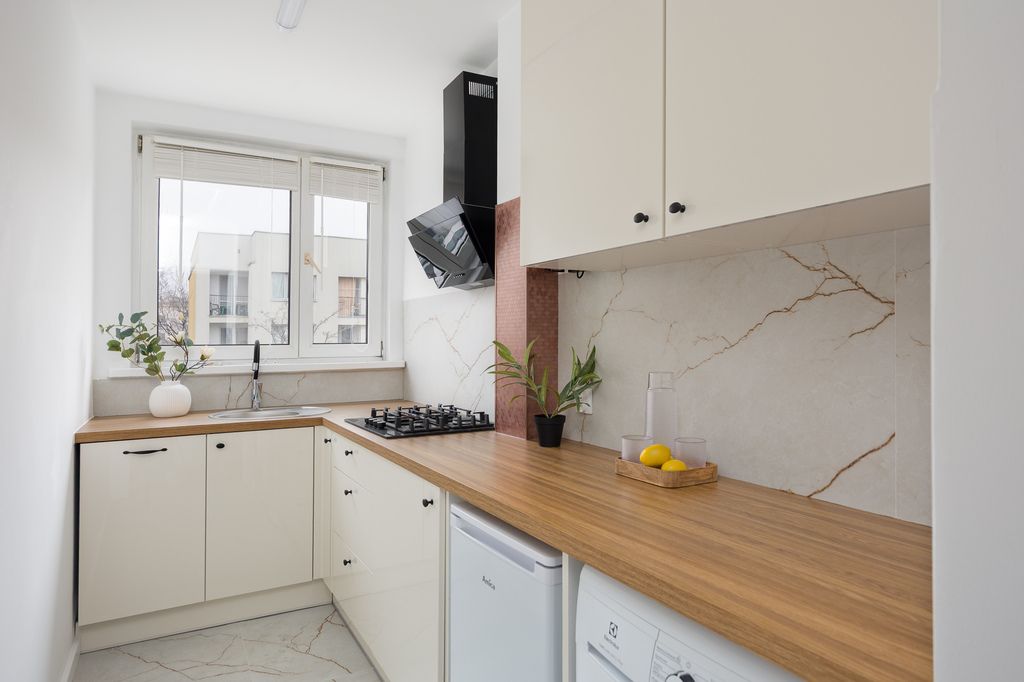 – Oddzielna, widna kuchnia – wymienione blaty, zmywarka i okap,