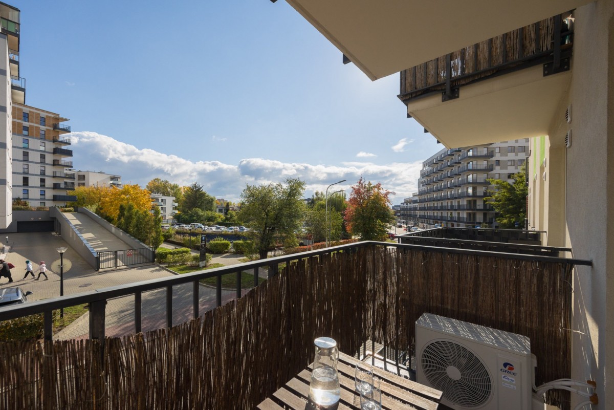Mieszkanie jest funkcjonalne i dobrze doświetlone – ekspozycja południowo-wschodnia. W pełni wyposażone w meble i sprzęt AGD (w tym zmywarkę), posiada zainstalowaną klimatyzację, co zwiększa komfort użytkowania.