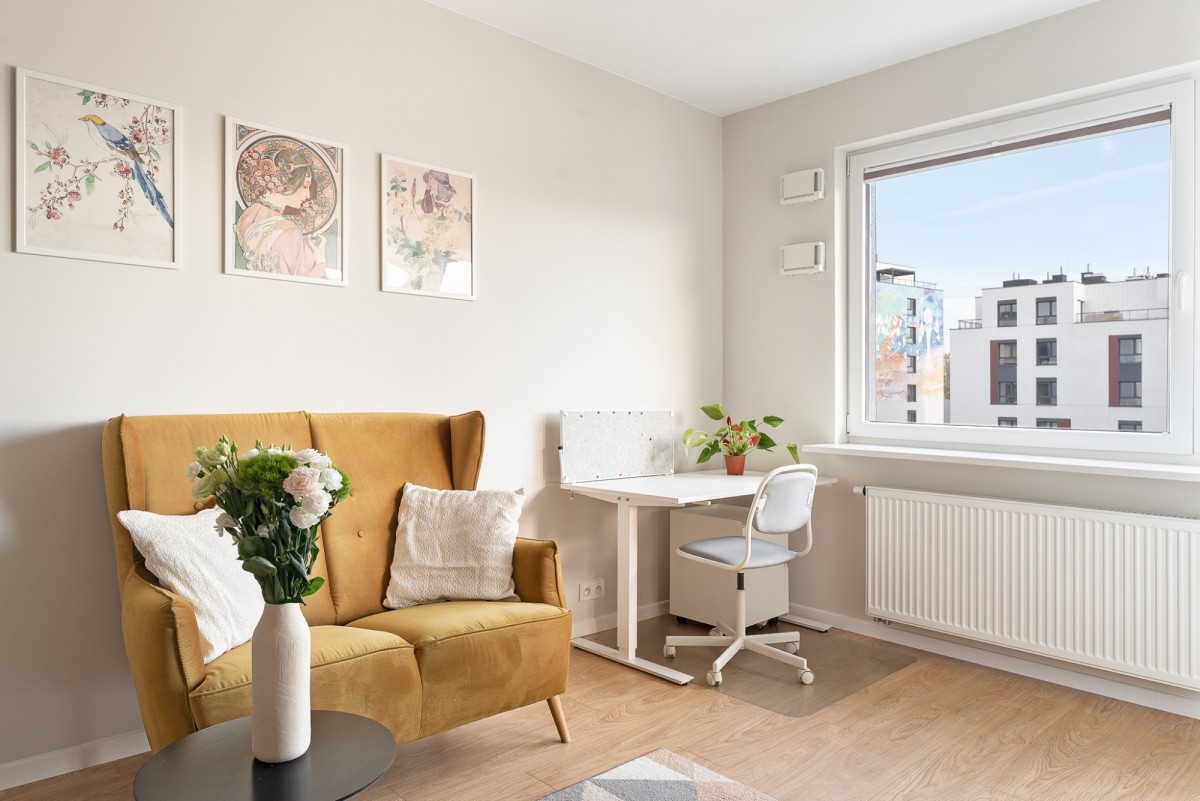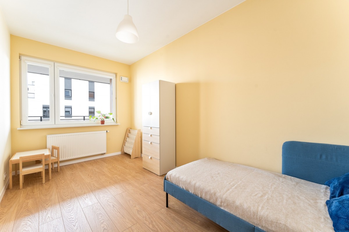 The apartment has an area of 62m2 and is located on the fifth floor. The living space consists of a living room with a comfortable sofa, a comfortable and spacious kitchen and a dining area. From the living room we have access to the balcony, which offers a view of Żoliborz. The private space includes a master bedroom, a second room that can be arranged as a children’s bedroom or a study, and a spacious bathroom with a bathtub with a shower function.