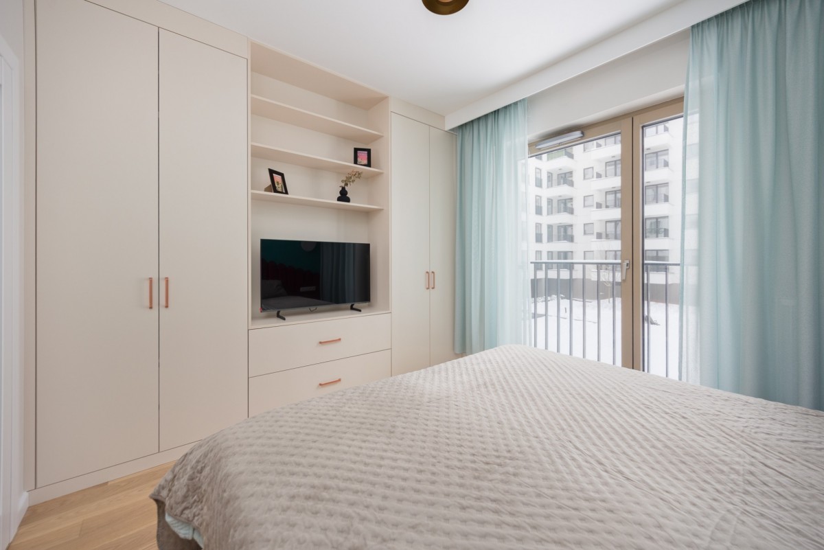 - Sypialnia z balkonem francuskim i pojemnymi szafami