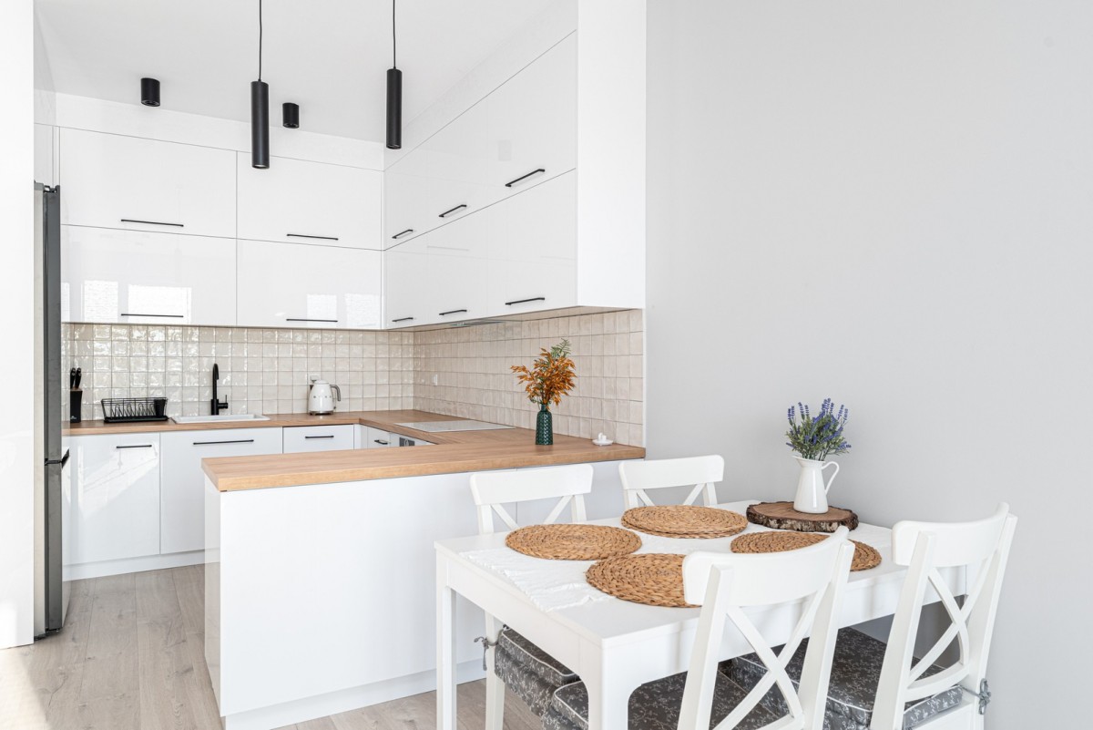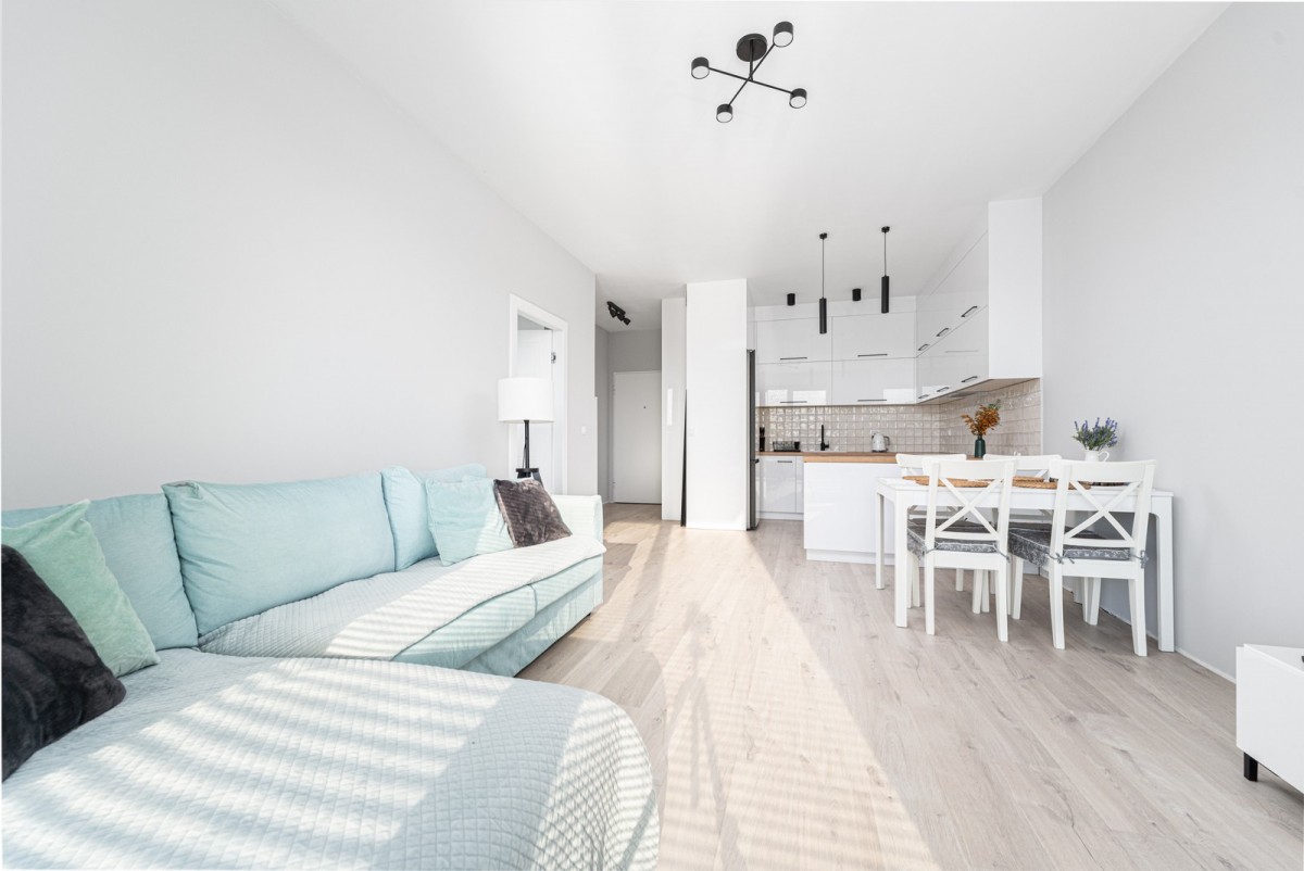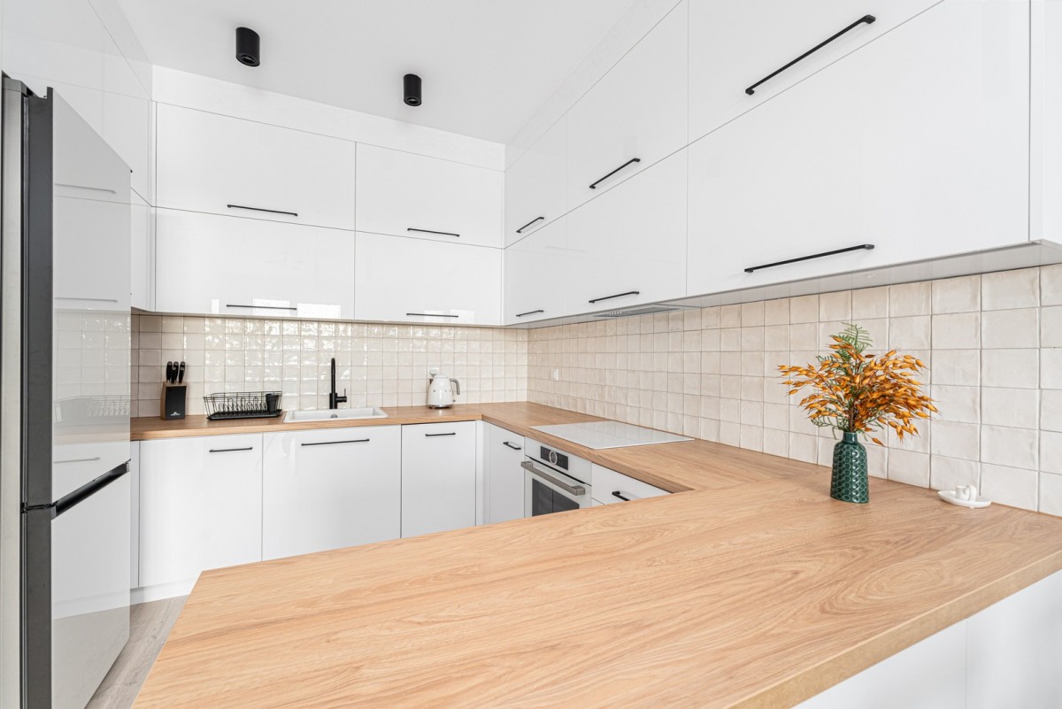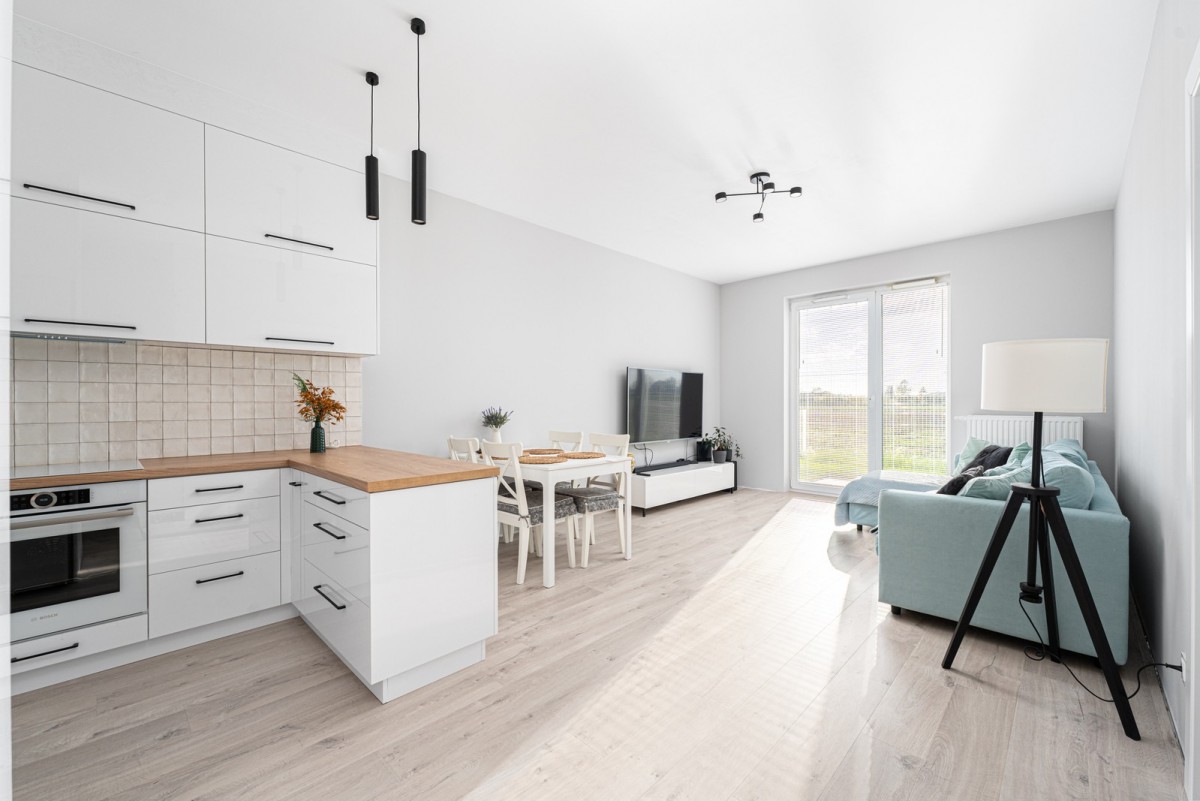 Pokój dzienny połączono z jadalnią oraz aneksem kuchennym. Kuchnia została wyposażona w pełną zabudowę w perłowej bieli z brązowym blatem roboczym – całość tworzy przytulne i nowoczesne wnętrze. Do dyspozycji są wszystkie niezbędne sprzęty AGD renomowanych marek: lodówka, płyta indukcyjna, piekarnik elektryczny, zmywarka oraz okap.