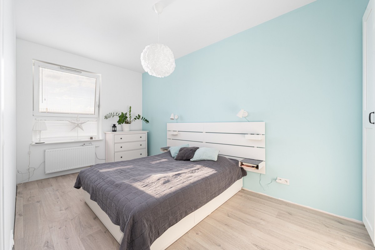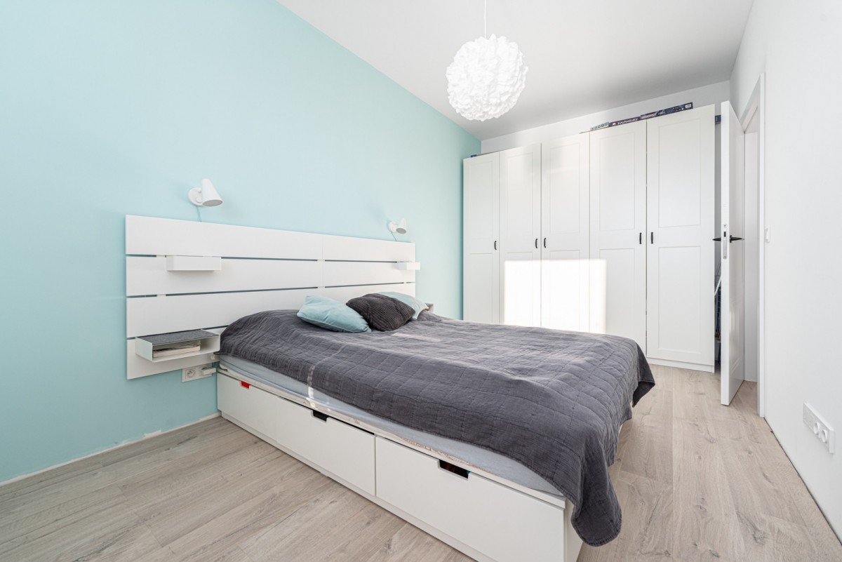 Duża, ustawna sypialnia (ok. 15m2) została wyposażona w szafę, duże łóżko dwuosobowe oraz komodę. Podobnie jak salon – ma ekspozycję zachodnią, a podłogę pokrywają panele laminowane. Na potrzeby przechowywania przewidziano dużą szafę w zabudowie wykonaną na wymiar – funkcjonalną i estetyczną.