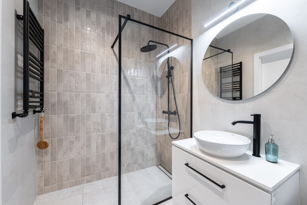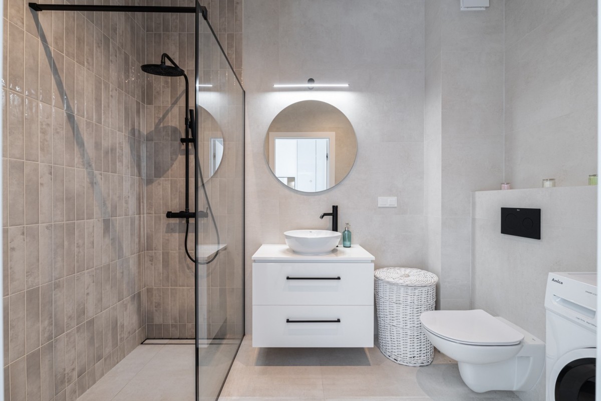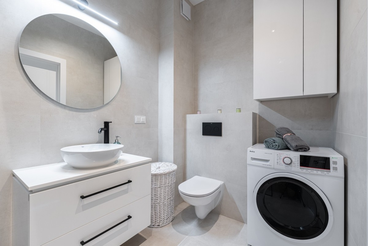 Łazienka o powierzchni 4,85m2 została wyposażona w kabinę prysznicową typu walk-in, podtynkowy zestaw WC, umywalkę z szafkami oraz pralkę. Na podłodzie znajdziemy gres.